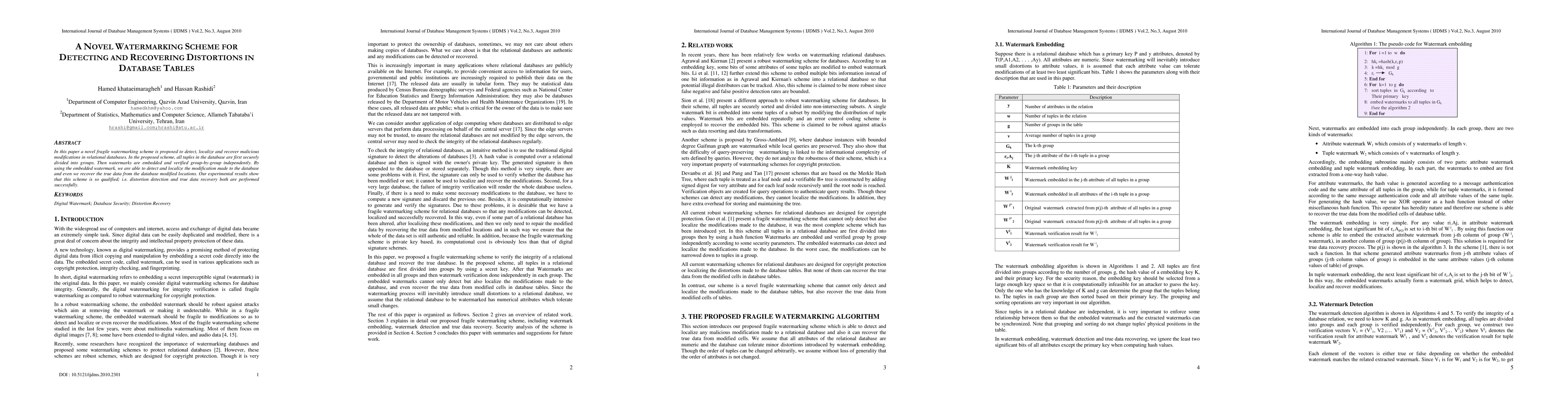 This paper proposes a novel fragile watermarking scheme to detect, localize, and recover malicious modifications in relational databases. The scheme divides database tuples into secure groups, embeds and verifies watermarks independently, ensuring successful distortion detection and true data recovery.