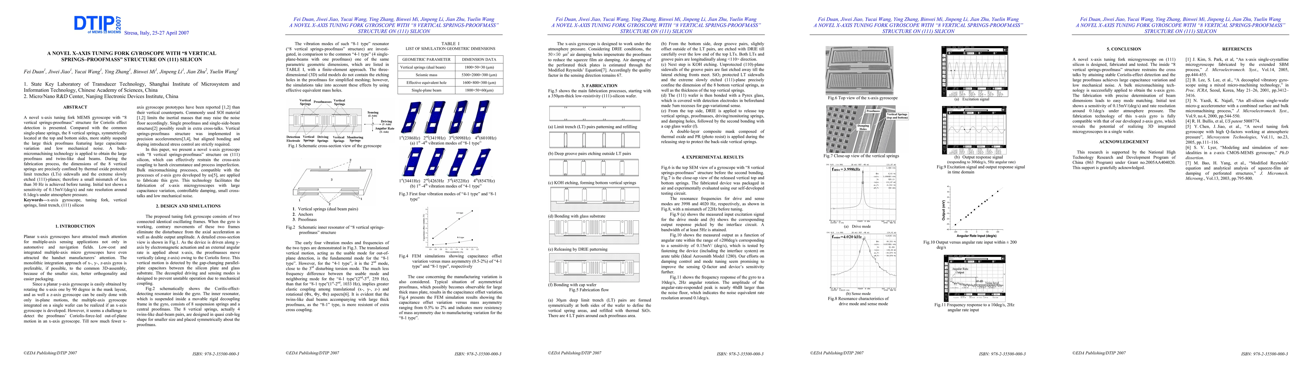 A novel x-axis tuning fork MEMS gyroscope with "8 vertical springs-proofmass" structure for Coriolis effect detection is presented. Compared with the common single-plane springs, the 8 vertical springs, symmetrically located at the top and bottom sides, more stably suspend the large thick proofmass featuring large capacitance variation and low mechanical noise. A bulk-micromachining technology is applied to obtain the large proofmass and twins-like dual beams. During the fabrication process, the dimensions of the 8 vertical springs are precisely confined by thermal oxide protected limit trenches (LTs) sidewalls and the extreme slowly etched (111)-planes; therefore a small mismatch of less than 30 Hz is achieved before tuning. Initial test shows a sensitivity of 0.15mV/(deg/s) and rate resolution around 0.1deg/s under atmosphere pressure.