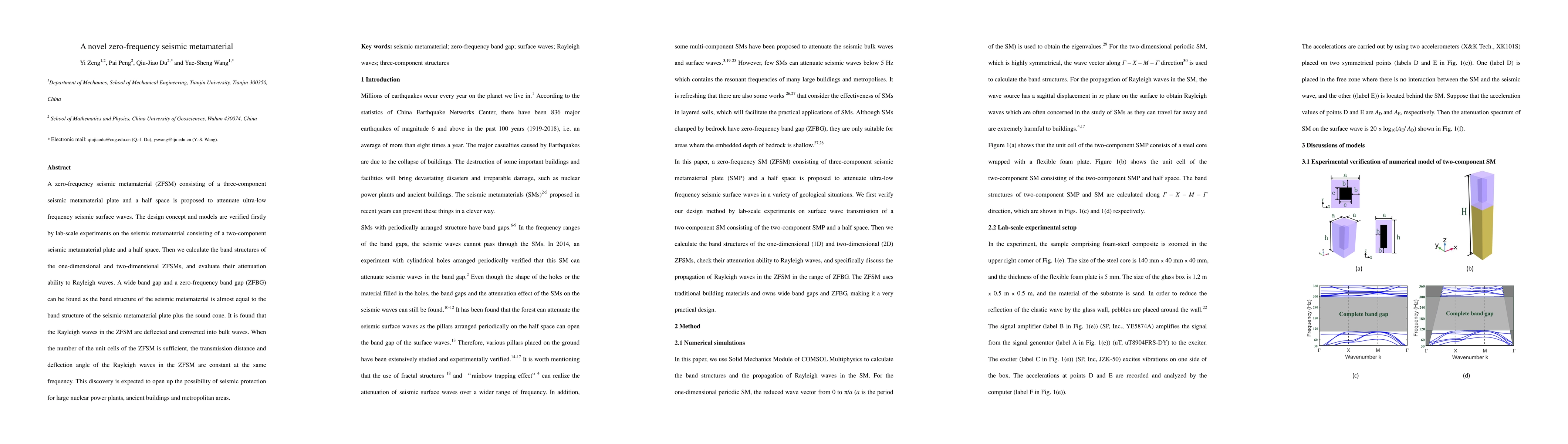 A zero-frequency seismic metamaterial (ZFSM) consisting of a three-component seismic metamaterial plate and a half space is proposed to attenuate ultra-low frequency seismic surface waves. The design concept and models are verified firstly by lab-scale experiments on the seismic metamaterial consisting of a two-component seismic metamaterial plate and a half space. Then we calculate the band structures of the one-dimensional and two-dimensional ZFSMs, and evaluate their attenuation ability to Rayleigh waves. A wide band gap and a zero-frequency band gap (ZFBG) can be found as the band structure of the seismic metamaterial is almost equal to the band structure of the seismic metamaterial plate plus the sound cone. It is found that the Rayleigh waves in the ZFSM are deflected and converted into bulk waves. When the number of the unit cells of the ZFSM is sufficient, the transmission distance and deflection angle of the Rayleigh waves in the ZFSM are constant at the same frequency. This discovery is expected to open up the possibility of seismic protection for large nuclear power plants, ancient buildings and metropolitan areas.