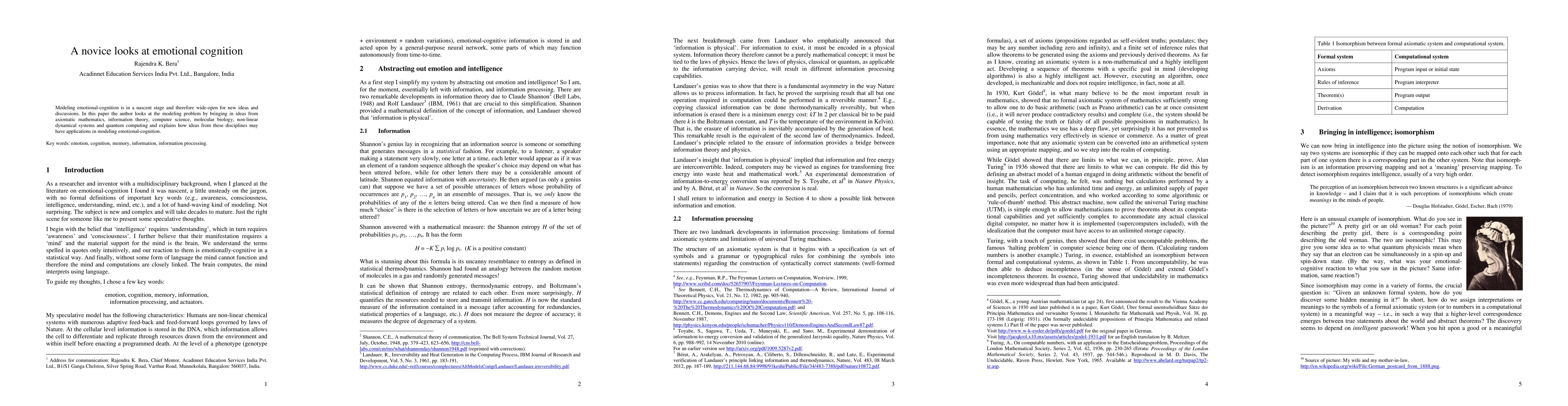 Modeling emotional-cognition is in a nascent stage and therefore wide-open for new ideas and discussions. In this paper the author looks at the modeling problem by bringing in ideas from axiomatic mathematics, information theory, computer science, molecular biology, non-linear dynamical systems and quantum computing and explains how ideas from these disciplines may have applications in modeling emotional-cognition.
