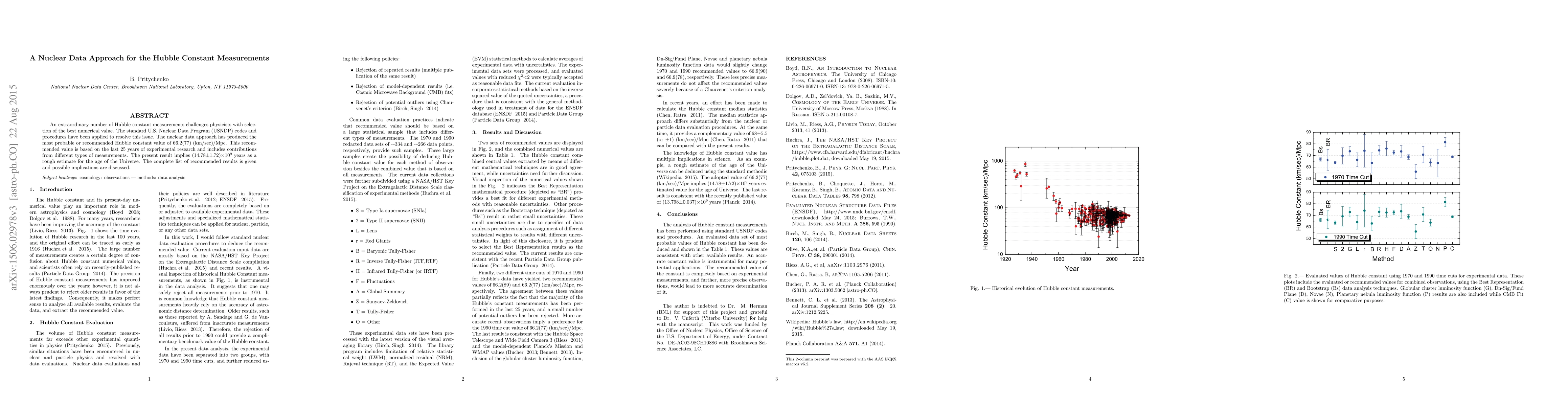 This paper applies the U.S. Nuclear Data Program to determine the most probable Hubble constant value of 66.2(77) (km/sec)/Mpc, based on 25 years of experimental data and various measurements. The recommended value suggests an approximate age of the Universe of (14.78±1.72)×10^9 years.