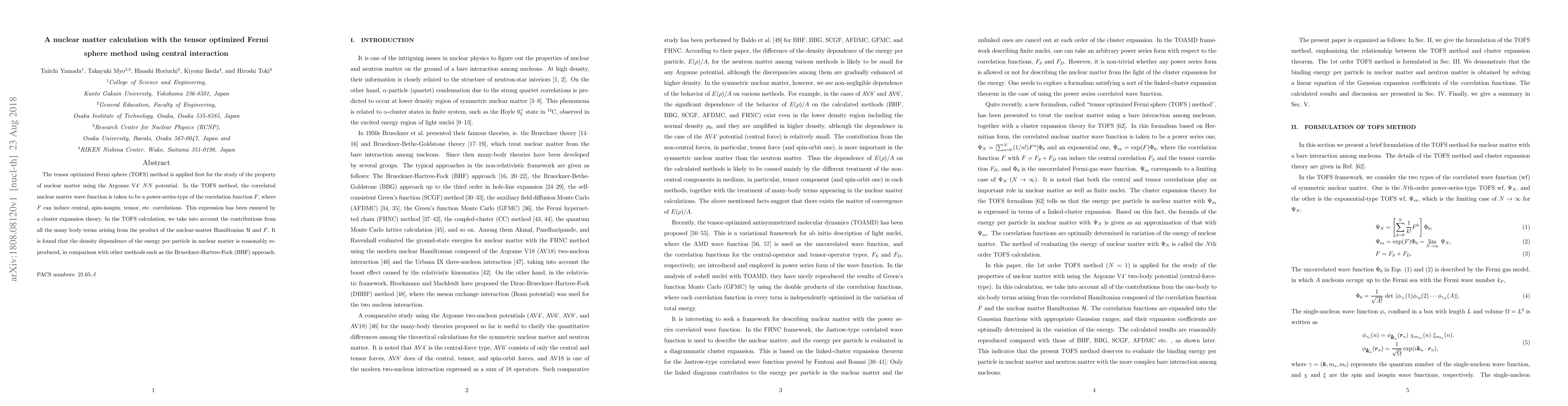 The tensor optimized Fermi sphere (TOFS) method is applied first for the study of the property of nuclear matter using the Argonne V4' $NN$ potential. In the TOFS method, the correlated nuclear matter wave function is taken to be a power-series-type of the correlation function $F$, where $F$ can induce central, spin-isospin, tensor, etc.~correlations. This expression has been ensured by a cluster expansion theory. In the TOFS calculation, we take into account the contributions from all the many body terms arising from the product of the nuclear-matter Hamiltonian $\mathcal{H}$ and $F$. It is found that the density dependence of the energy per particle in nuclear matter is reasonably reproduced, in comparison with other methods such as the Brueckner-Hartree-Fock (BHF) approach.