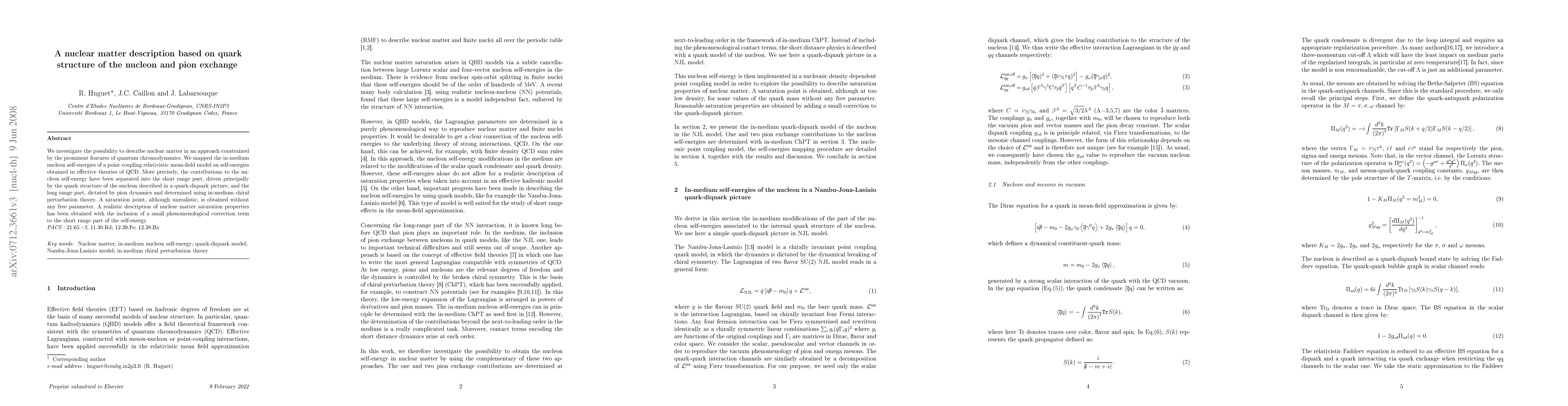 We investigate the possibility to describe nuclear matter in an approach constrained by the prominent features of quantum chromodynamics. We mapped the in-medium nucleon self-energies of a point coupling relativistic mean-field model on self-energies obtained in effective theories of QCD. More precisely, the contributions to the nucleon self-energy have been separated into the short range part, driven principally by the quark structure of the nucleon described in a quark-diquark picture, and the long range part, dictated by pion dynamics and determined using in-medium chiral perturbation theory. A saturation point, although unrealistic, is obtained without any free parameter. A realistic description of nuclear matter saturation properties has been obtained with the inclusion of a small phenomenological correction term to the short range part of the self-energy.