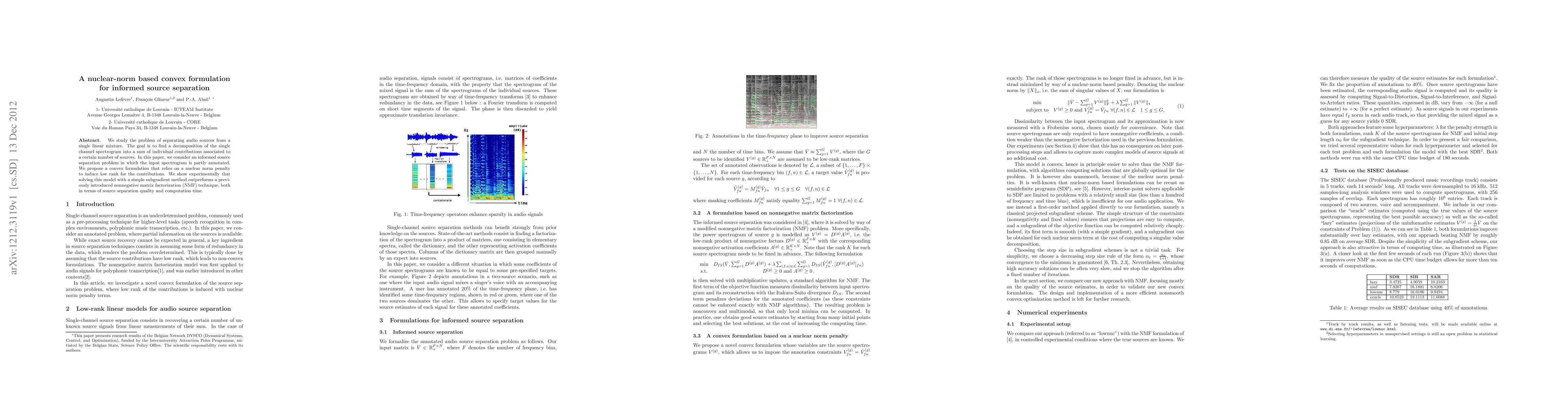 We study the problem of separating audio sources from a single linear mixture. The goal is to find a decomposition of the single channel spectrogram into a sum of individual contributions associated to a certain number of sources. In this paper, we consider an informed source separation problem in which the input spectrogram is partly annotated. We propose a convex formulation that relies on a nuclear norm penalty to induce low rank for the contributions. We show experimentally that solving this model with a simple subgradient method outperforms a previously introduced nonnegative matrix factorization (NMF) technique, both in terms of source separation quality and computation time.