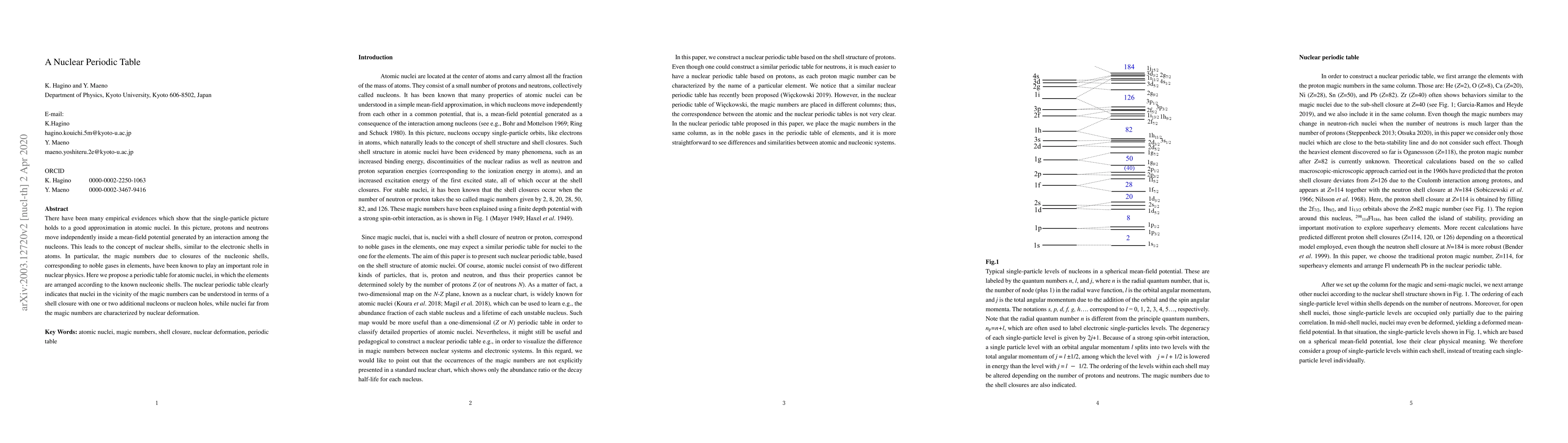 This paper proposes a nuclear periodic table that arranges atomic nuclei based on nucleonic shells, similar to electronic shells in atoms, highlighting the significance of magic numbers and shell closures in understanding nuclear stability and deformation.