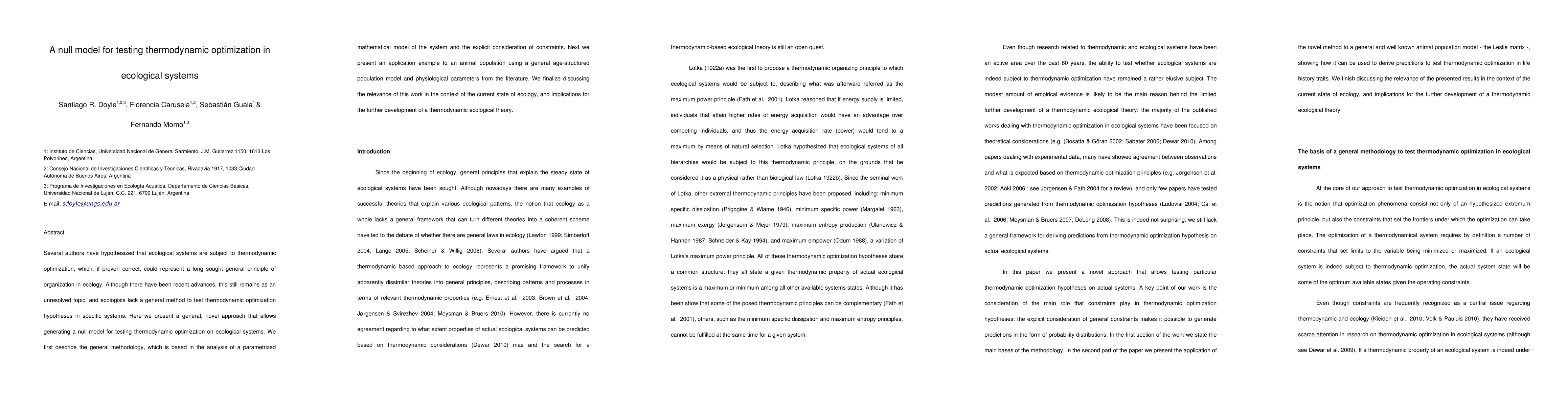 This paper introduces a novel null model methodology to test thermodynamic optimization in ecological systems, providing a framework based on mathematical modeling and constraints. An example application to an animal population demonstrates the approach's feasibility, highlighting potential advancements in ecological theory.