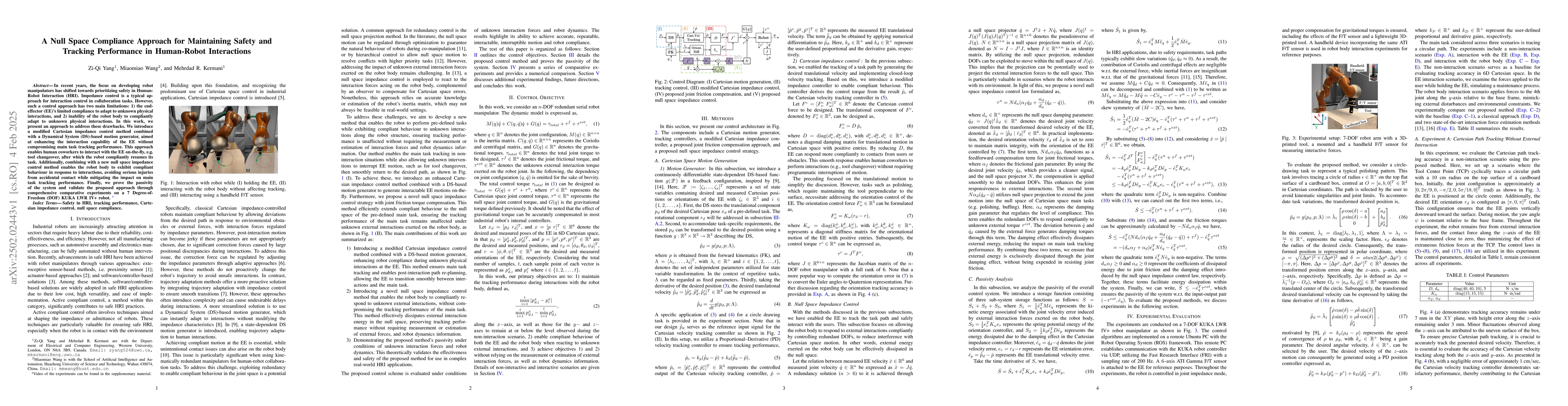This paper proposes a null space compliance approach to enhance safety and tracking performance in human-robot interactions. It combines modified Cartesian impedance control with a DS-based motion generator and null space impedance control to improve end-effector and robot body compliance, validated through experiments on a KUKA LWR IV+ robot.