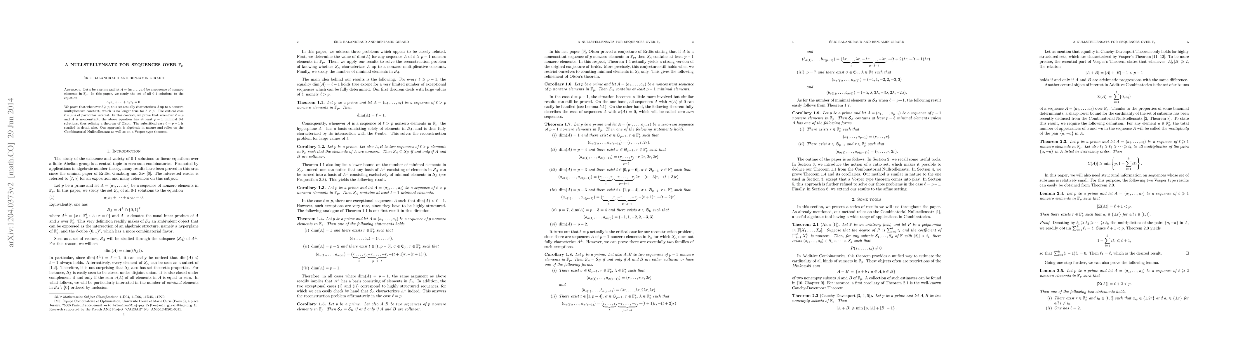 Let p be a prime and let A=(a_1,...,a_l) be a sequence of nonzero elements in F_p. In this paper, we study the set of all 0-1 solutions to the equation a_1 x_1 + ... + a_l x_l = 0. We prove that whenever l >= p, this set actually characterizes A up to a nonzero multiplicative constant, which is no longer true for l < p. The critical case l=p is of particular interest. In this context, we prove that whenever l=p and A is nonconstant, the above equation has at least p-1 minimal 0-1 solutions, thus refining a theorem of Olson. The subcritical case l=p-1 is studied in detail also. Our approach is algebraic in nature and relies on the Combinatorial Nullstellensatz as well as on a Vosper type theorem.
