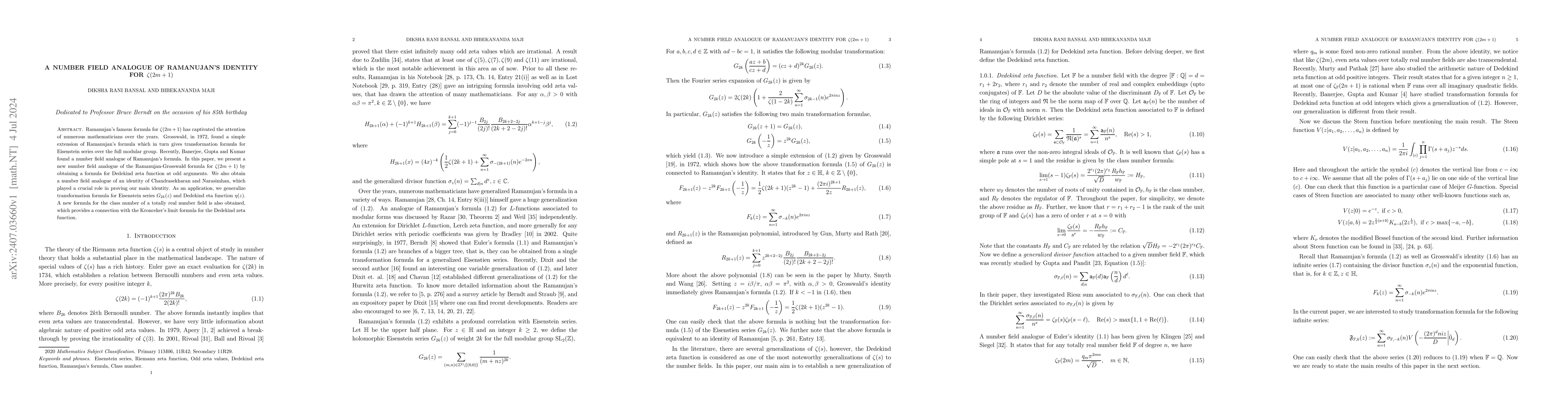 This paper introduces a number field analogue of Ramanujan's formula for $\zeta(2m+1)$, deriving a new expression for the Dedekind zeta function at odd arguments and generalizing the transformation formula for Eisenstein series and the Dedekind eta function. It also connects these results to a new formula for the class number of a totally real number field, linking to Kronecker's limit formula.