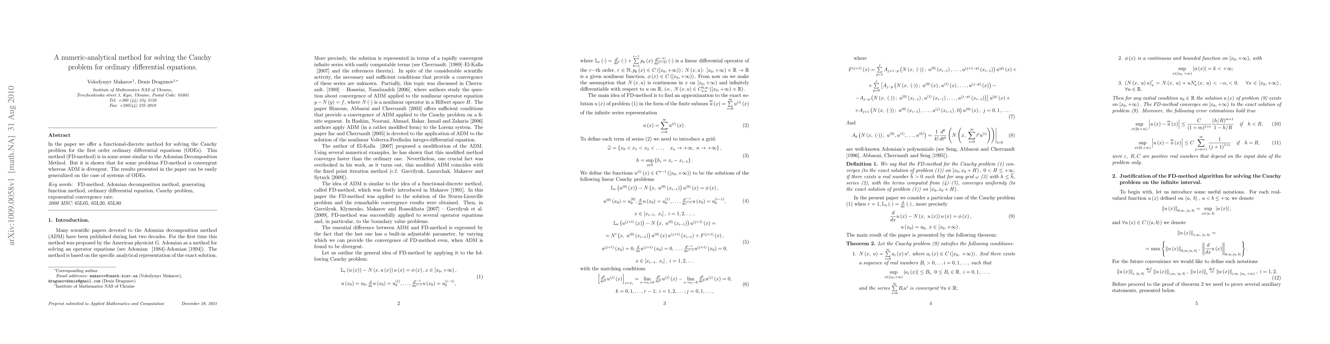 In the paper we offer a functional-discrete method for solving the Cauchy problem for the first order ordinary differential equations (ODEs). This method (FD-method) is in some sense similar to the Adomian Decomposition Method. But it is shown that for some problems FD-method is convergent whereas ADM is divergent. The results presented in the paper can be easily generalized on the case of systems of ODEs.