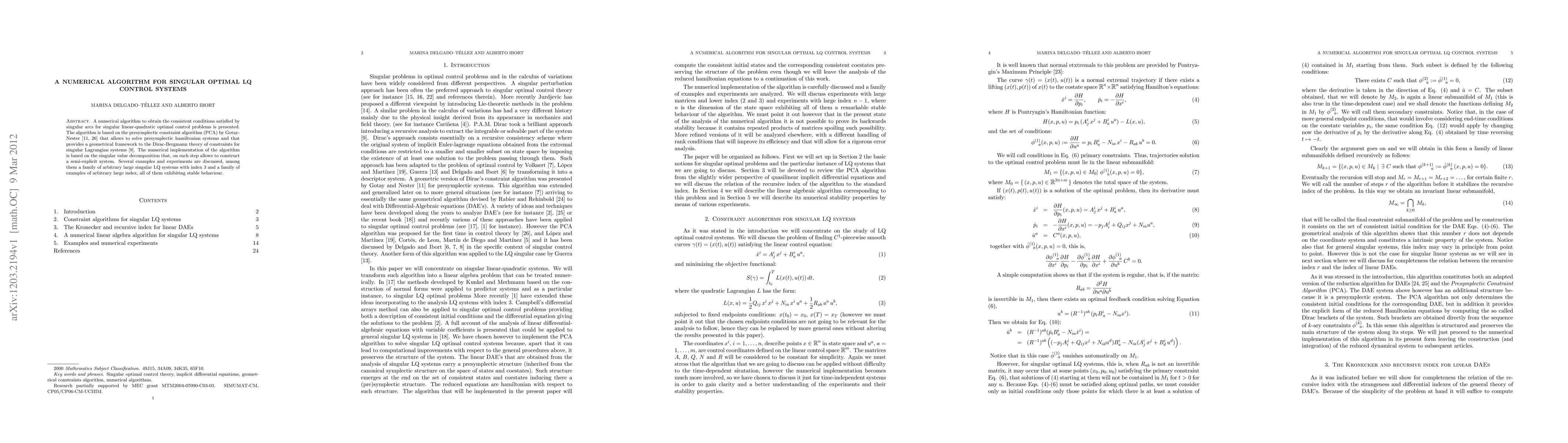 A numerical algorithm to obtain the consistent conditions satisfied by singular arcs for singular linear-quadratic optimal control problems is presented. The algorithm is based on the presymplectic constraint algorithm (PCA) by Gotay-Nester \cite{Go78,Vo99} that allows to solve presymplectic hamiltonian systems and that provides a geometrical framework to the Dirac-Bergmann theory of constraints for singular Lagrangian systems \cite{Di49}. The numerical implementation of the algorithm is based on the singular value decomposition that, on each step allows to construct a semi-explicit system. Several examples and experiments are discussed, among them a family of arbitrary large singular LQ systems with index 3 and a family of examples of arbitrary large index, all of them exhibiting stable behaviour.