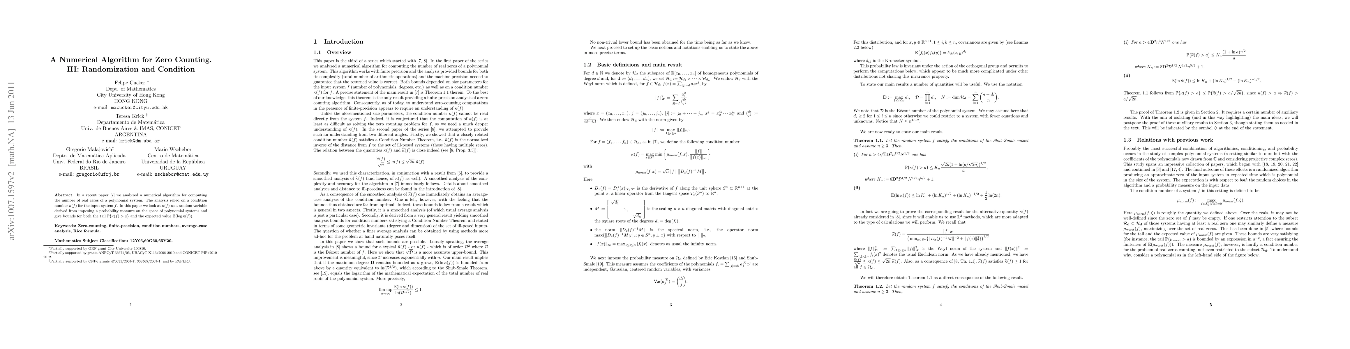 This paper explores a numerical algorithm for counting real zeros of polynomial systems, analyzing the condition number kappa(f) as a random variable influenced by a probability measure on polynomial systems. It provides bounds for the tail probability P{kappa(f) > a} and the expected value E(log kappa(f)).