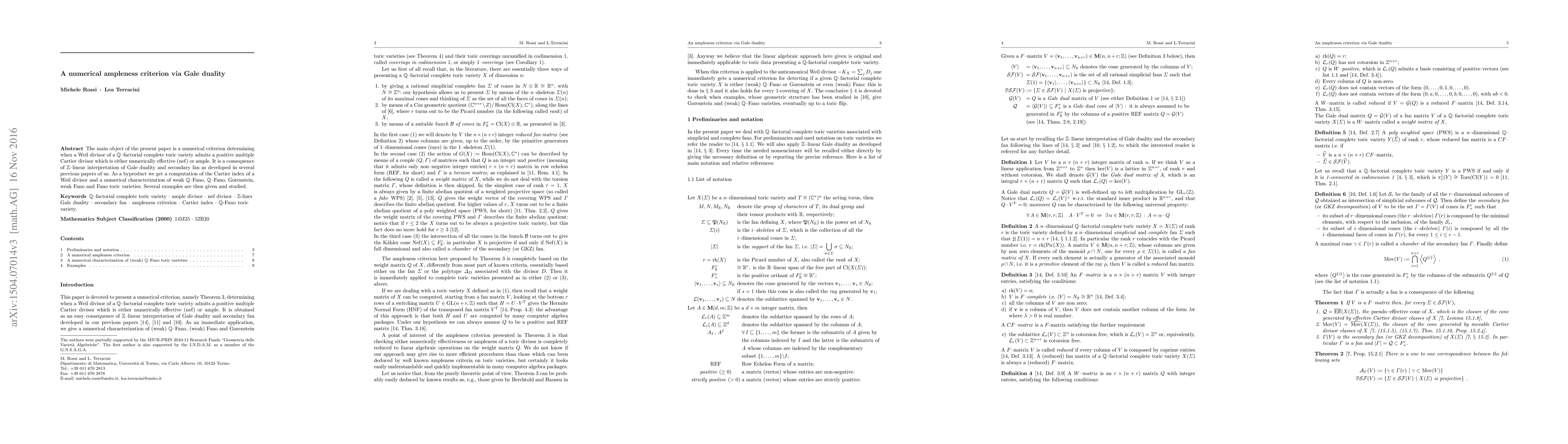 The establishment of a numerical ampleness criterion via Gale duality provides a powerful new tool for analyzing the properties of Q-factorial complete toric varieties.