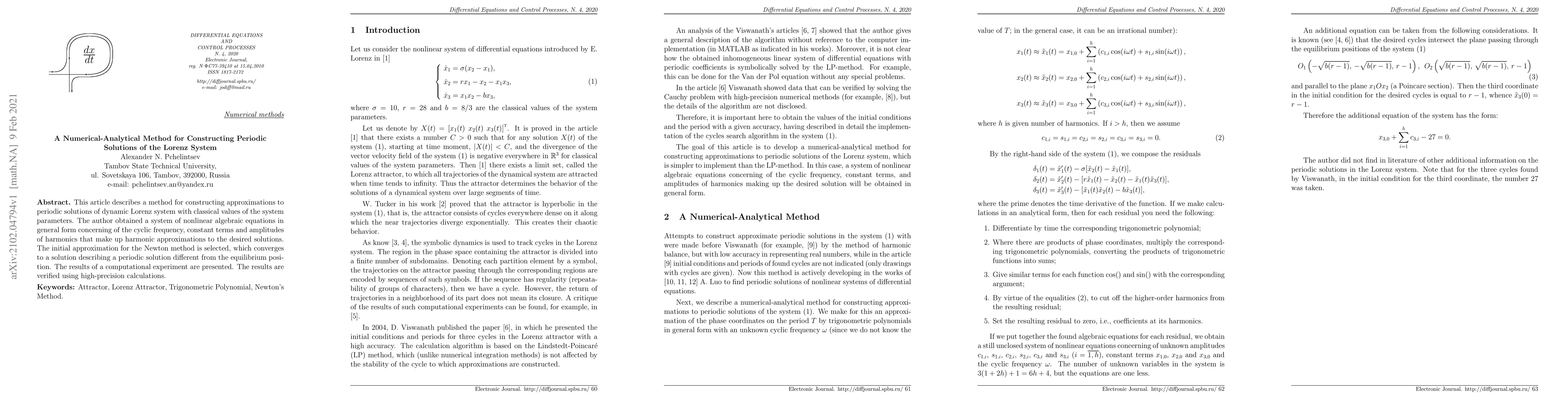 This paper presents a numerical-analytical method for approximating periodic solutions of the Lorenz system, deriving a system of nonlinear algebraic equations and applying the Newton method to find a non-equilibrium periodic solution, with results verified through high-precision computations.