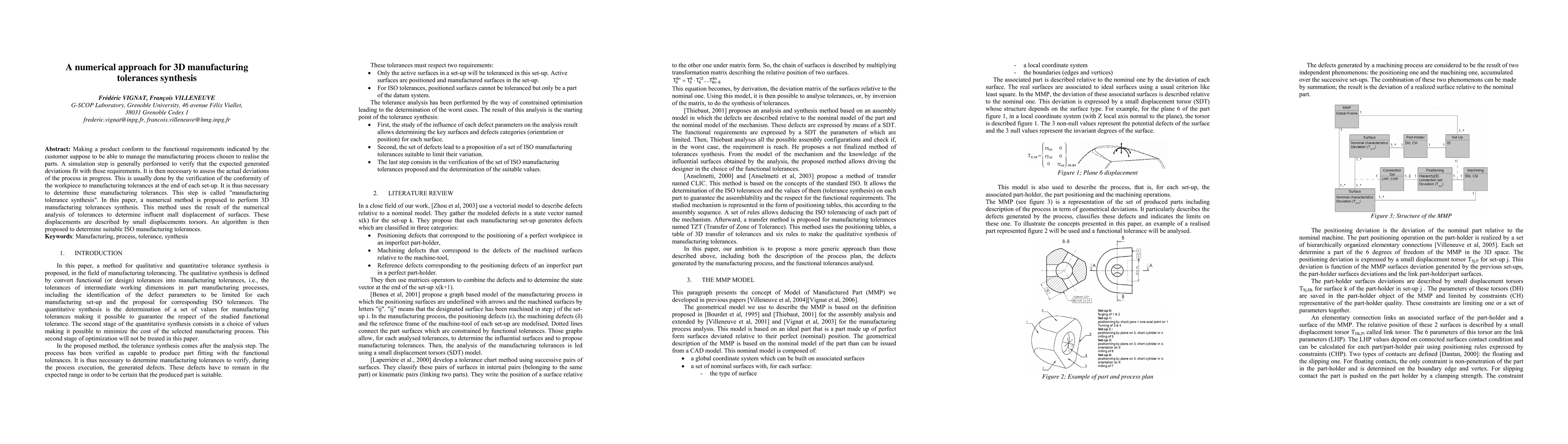 This paper proposes a numerical method to synthesize manufacturing tolerances for 3D manufacturing processes, using small displacement torsors to determine suitable ISO tolerances.