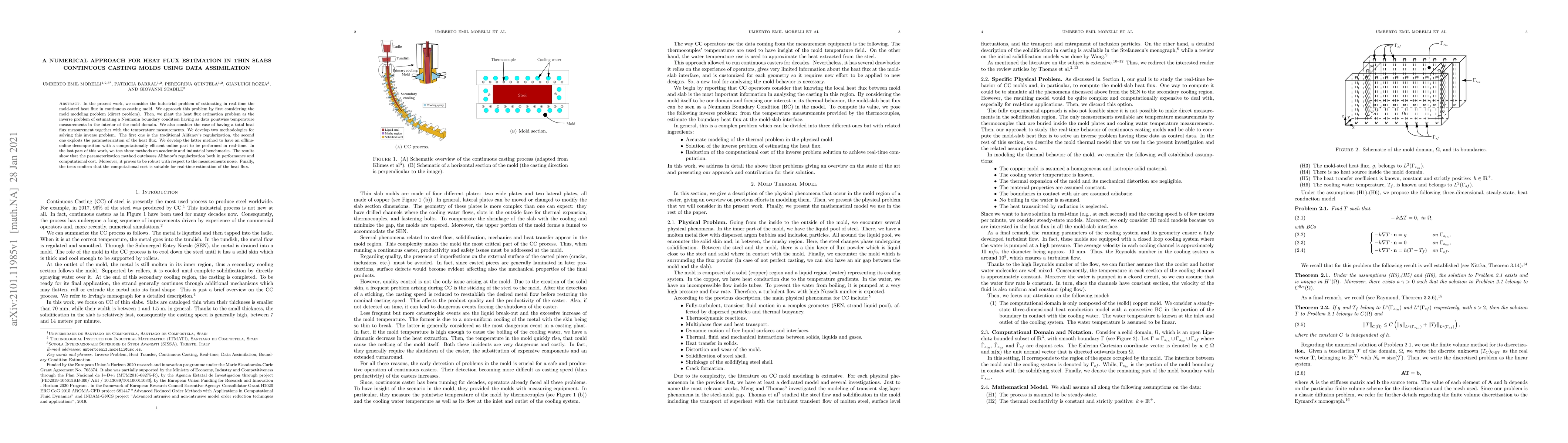 This research presents a numerical method for estimating heat flux in thin steel casting molds using data assimilation. It solves an inverse problem with two methodologies: Alifanov's regularization and a novel parameterization technique. The parameterization method, demonstrated through academic and industrial benchmarks, outperforms Alifanov's in accuracy, computational cost, and noise resistance, making it suitable for real-time industrial applications.