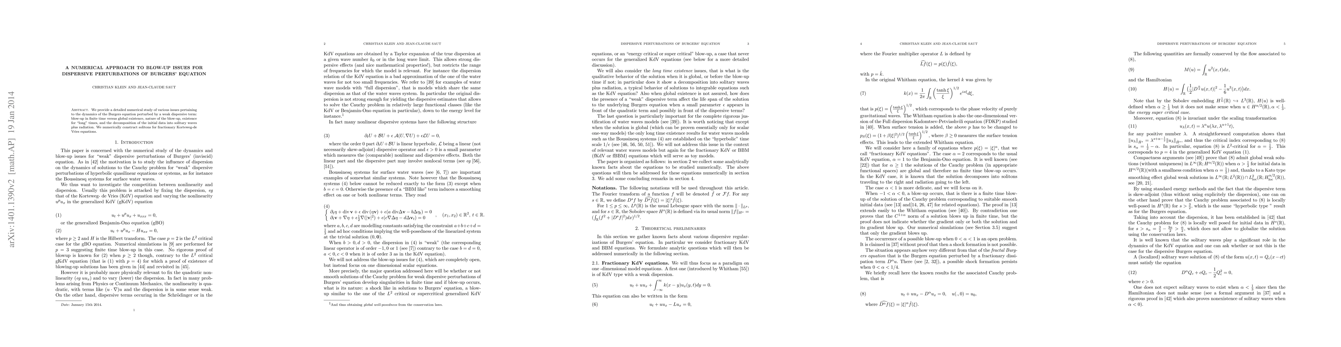 We provide a detailed numerical study of various issues pertaining to the dynamics of the Burgers equation perturbed by a weak dispersive term: blow-up in finite time versus global existence, nature of the blow-up, existence for "long" times, and the decomposition of the initial data into solitary waves plus radiation. We numerically construct solitons for fractionary Korteweg-de Vries equations.