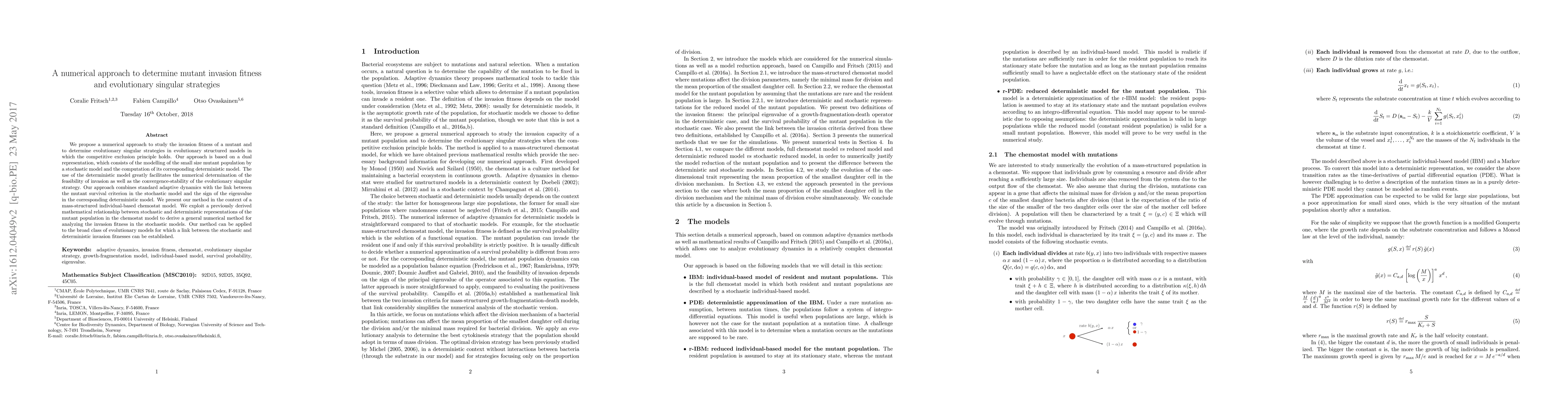 We propose a numerical approach to study the invasion fitness of a mutant and to determine evolutionary singular strategies in evolutionary structured models in which the competitive exclusion principle holds. Our approach is based on a dual representation, which consists of the modelling of the small size mutant population by a stochastic model and the computation of its corresponding deterministic model. The use of the deterministic model greatly facilitates the numerical determination of the feasibility of invasion as well as the convergence-stability of the evolutionary singular strategy. Our approach combines standard adaptive dynamics with the link between the mutant survival criterion in the stochastic model and the sign of the eigenvalue in the corresponding deterministic model. We present our method in the context of a mass-structured individual-based chemostat model. We exploit a previously derived mathematical relationship between stochastic and deterministic representations of the mutant population in the chemostat model to derive a general numerical method for analyzing the invasion fitness in the stochastic models. Our method can be applied to the broad class of evolutionary models for which a link between the stochastic and deterministic invasion fitnesses can be established.