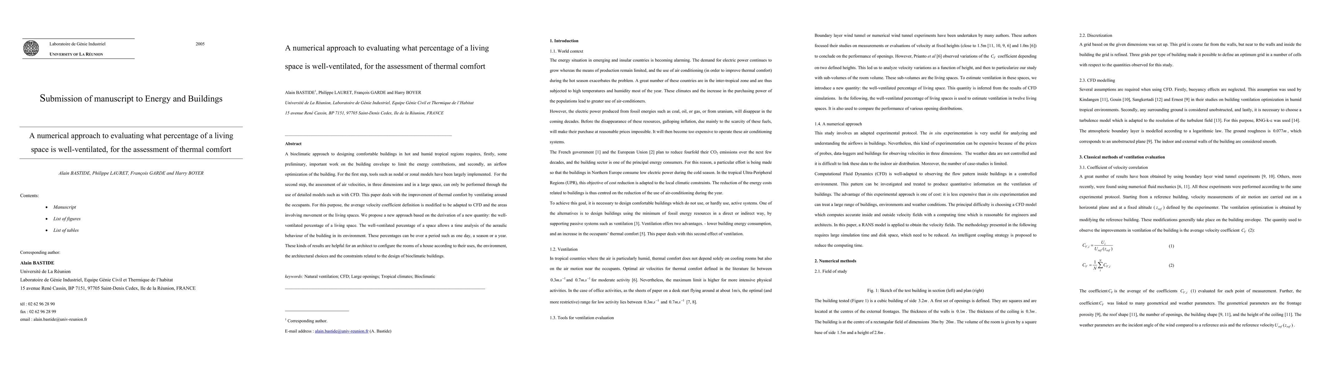 A bioclimatic approach to designing comfortable buildings in hot and humid tropical regions requires, firstly, some preliminary, important work on the building envelope to limit the energy contributions, and secondly, an airflow optimization of the building. For the first step, tools such as nodal or zonal models have been largely implemented. For the second step, the assessment of air velocities, in three dimensions and in a large space, can only be performed through the use of detailed models such as with CFD. This paper deals with the improvement of thermal comfort by ventilating around the occupants. For this purpose, the average velocity coefficient definition is modified to be adapted to CFD and the areas involving movement or the living spaces. We propose a new approach based on the derivation of a new quantity: the well-ventilated percentage of a living space. The well-ventilated percentage of a space allows a time analysis of the aeraulic behaviour of the building in its environment. These percentages can be over a period such as one day, a season or a year. These kinds of results are helpful for an architect to configure the rooms of a house according to their uses, the environment, the architectural choices and the constraints related to the design of bioclimatic buildings.