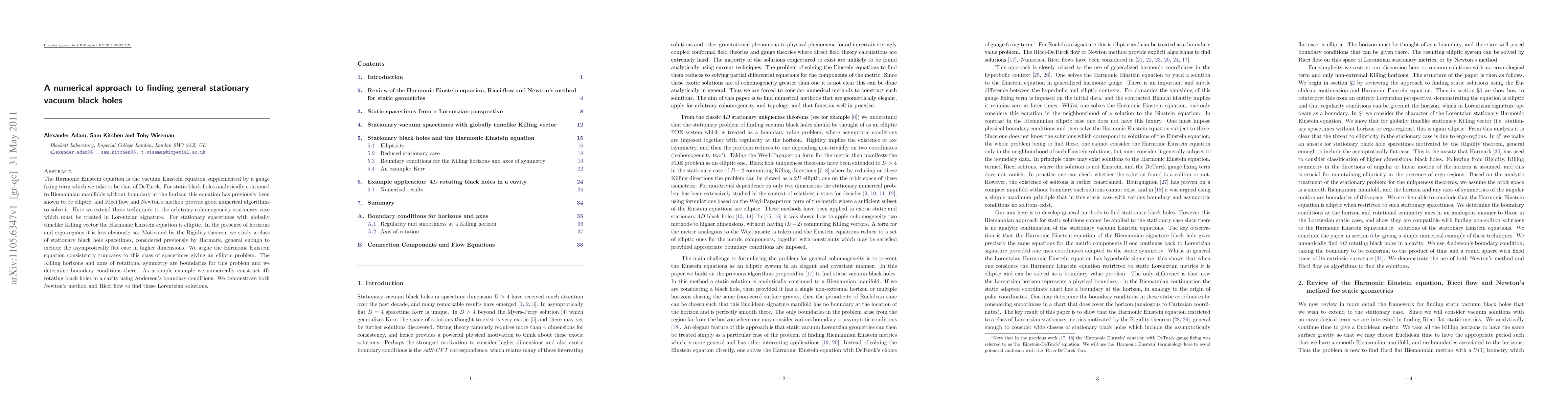This paper develops numerical methods to solve the Harmonic Einstein equation for general stationary vacuum black holes, extending previous techniques to handle the complexities of horizons and ergo-regions. The authors demonstrate the application of Newton's method and Ricci flow to construct 4D rotating black holes in a cavity, showing the equation's elliptic nature in the presence of these features.