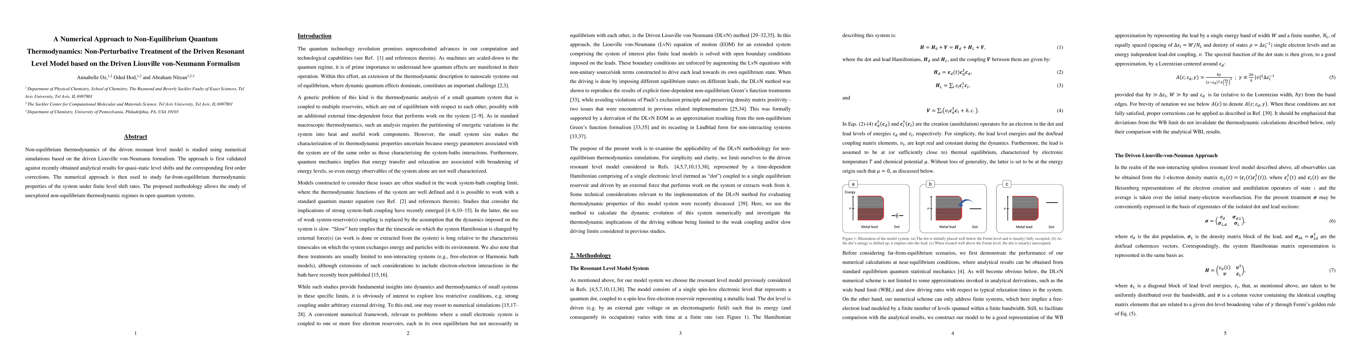 This paper presents a numerical method for studying non-equilibrium quantum thermodynamics using the driven Liouville von-Neumann formalism. The approach is validated against analytical results and is applied to explore thermodynamic properties in far-from-equilibrium conditions of the driven resonant level model.