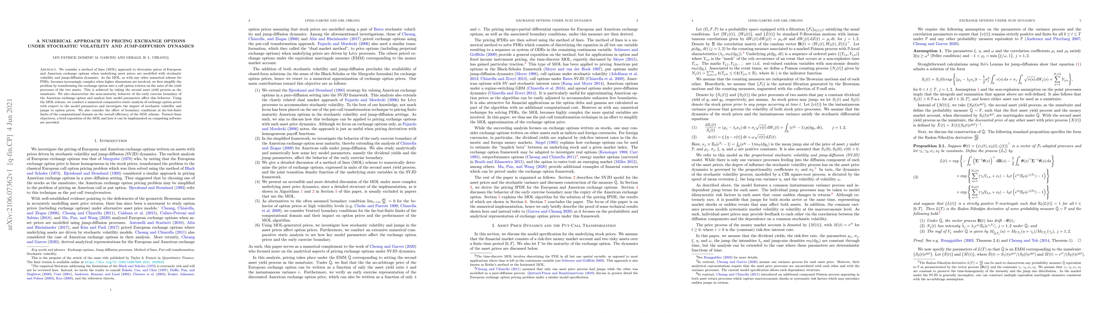 This paper proposes a method of lines (MOL) approach to price European and American exchange options under stochastic volatility and jump-diffusion dynamics, transforming the exchange option into a call option on the ratio of two asset yield processes. It analyzes the early exercise boundary of American options and examines the impact of model parameters on option prices.