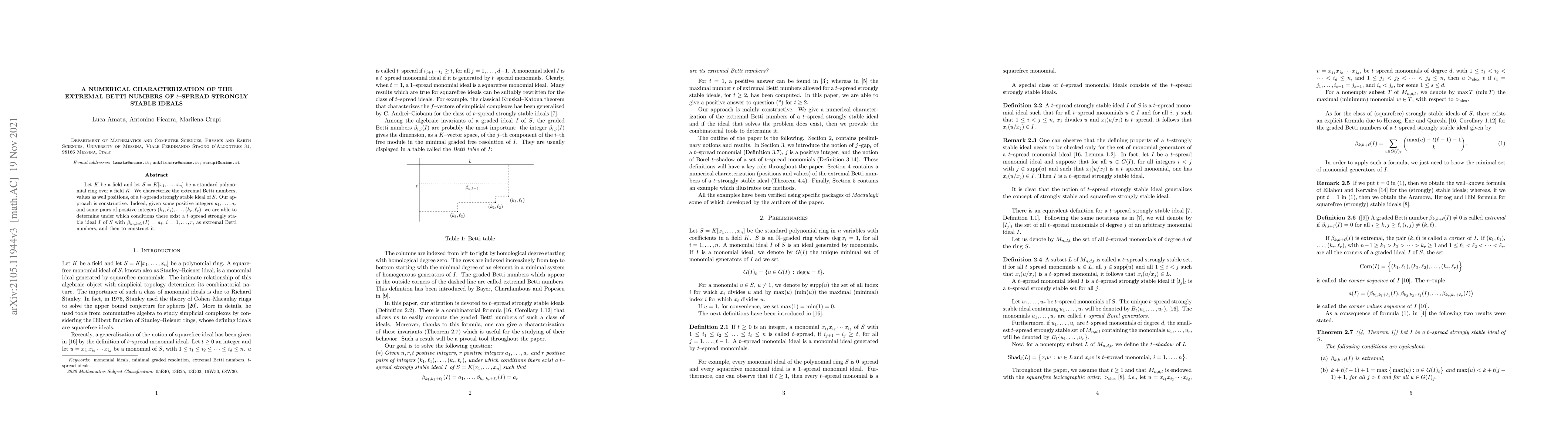 This paper characterizes the extremal Betti numbers of $t$-spread strongly stable ideals in polynomial rings over fields, determining both their values and positions through a constructive approach. The authors provide conditions and a method for constructing such ideals with specified extremal Betti numbers.
