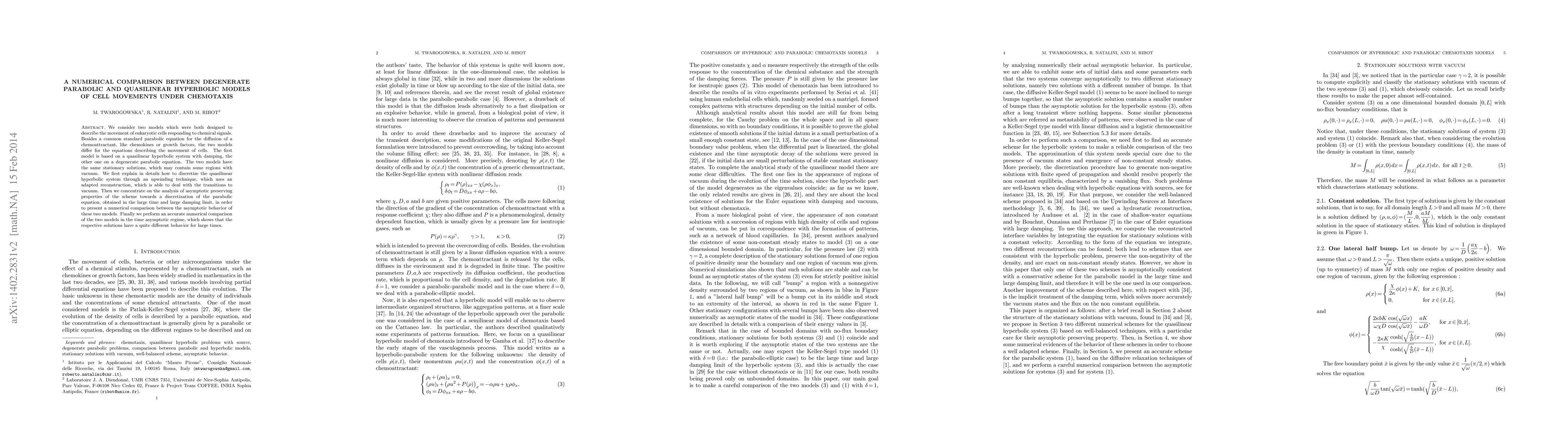 We consider two models which were both designed to describe the movement of eukaryotic cells responding to chemical signals. Besides a common standard parabolic equation for the diffusion of a chemoattractant, like chemokines or growth factors, the two models differ for the equations describing the movement of cells. The first model is based on a quasilinear hyperbolic system with damping, the other one on a degenerate parabolic equation. The two models have the same stationary solutions, which may contain some regions with vacuum. We first explain in details how to discretize the quasilinear hyperbolic system through an upwinding technique, which uses an adapted reconstruction, which is able to deal with the transitions to vacuum. Then we concentrate on the analysis of asymptotic preserving properties of the scheme towards a discretization of the parabolic equation, obtained in the large time and large damping limit, in order to present a numerical comparison between the asymptotic behavior of these two models. Finally we perform an accurate numerical comparison of the two models in the time asymptotic regime, which shows that the respective solutions have a quite different behavior for large times.