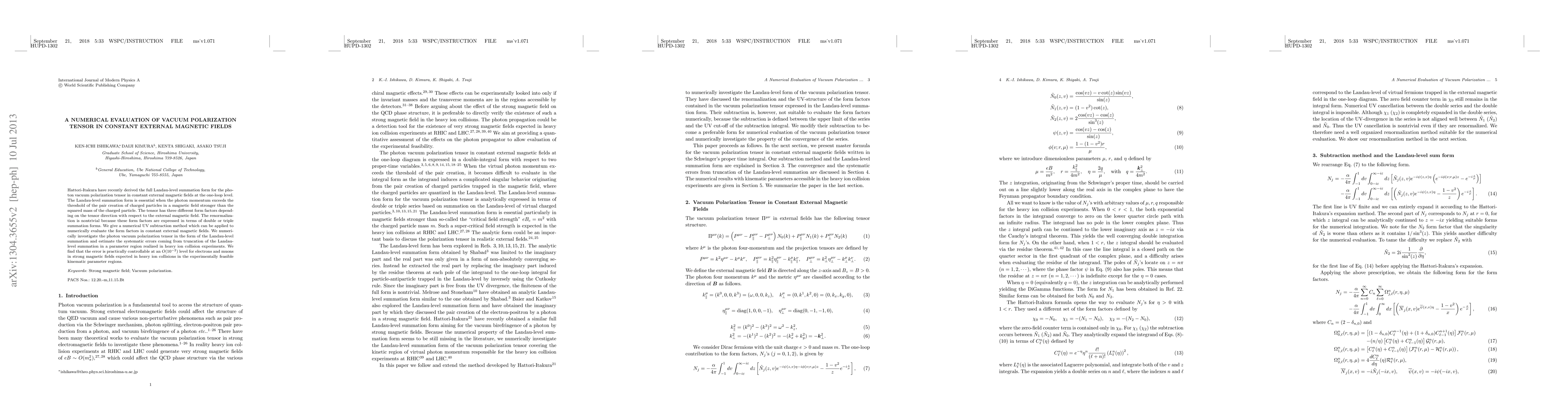 This paper presents a numerical evaluation method for the vacuum polarization tensor in constant external magnetic fields, derived from the Landau-level summation form. The study estimates systematic errors from truncation in heavy ion collision experiments, finding manageable errors at $O(10^{-2})$ for electrons and muons in strong magnetic fields.