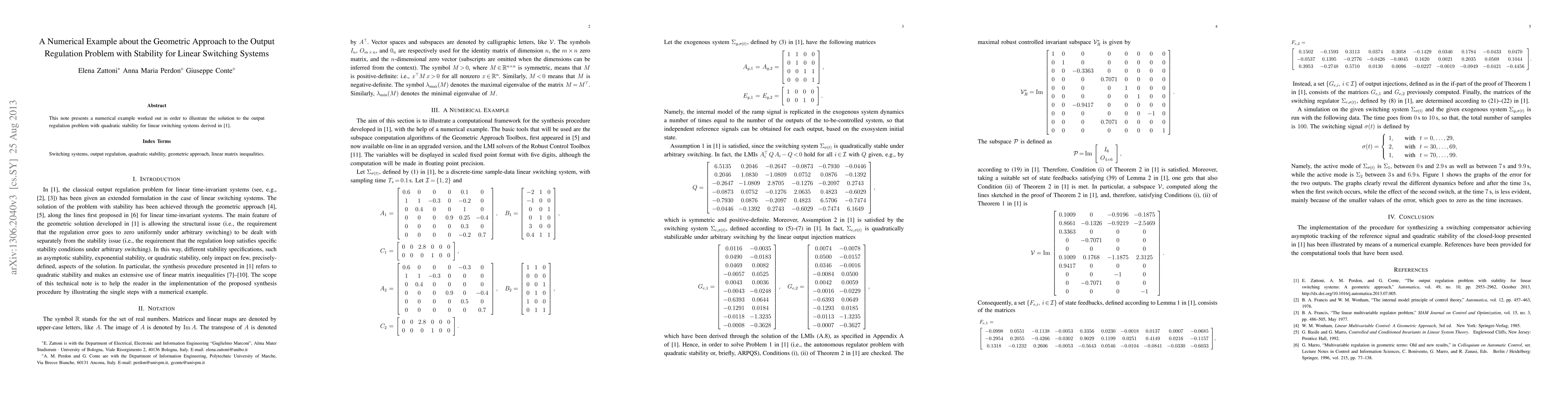 This note presents a numerical example worked out in order to illustrate the solution to the output regulation problem with quadratic stability for linear switching systems derived in [1].