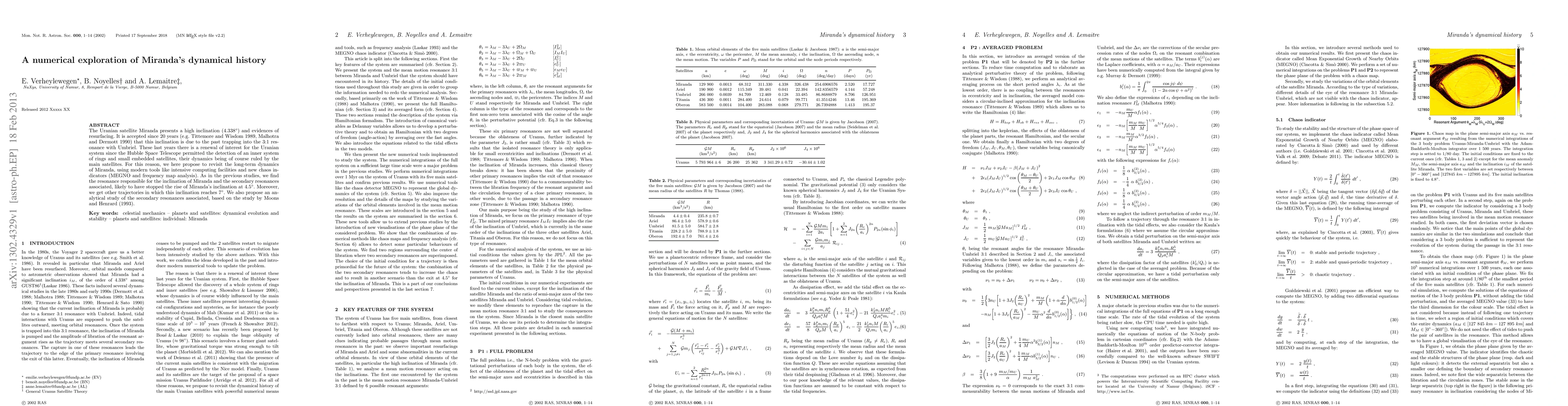 The Uranian satellite Miranda presents a high inclination (4.338{\deg}) and evidences of resurfacing. It is accepted since 20 years (e.g. Tittemore and Wisdom 1989, Malhotra and Dermott 1990) that this inclination is due to the past trapping into the 3:1 resonance with Umbriel. These last years there is a renewal of interest for the Uranian system since the Hubble Space Telescope permitted the detection of an inner system of rings and small embedded satellites, their dynamics being of course ruled by the main satellites. For this reason, we here propose to revisit the long-term dynamics of Miranda, using modern tools like intensive computing facilities and new chaos indicators (MEGNO and frequency map analysis). As in the previous studies, we find the resonance responsible for the inclination of Miranda and the secondary resonances associated, likely to have stopped the rise of Miranda's inclination at 4.5{\deg}. Moreover, we get other trajectories in which this inclination reaches 7{\deg}. We also propose an analytical study of the secondary resonances associated, based on the study by Moons and Henrard (1993).
