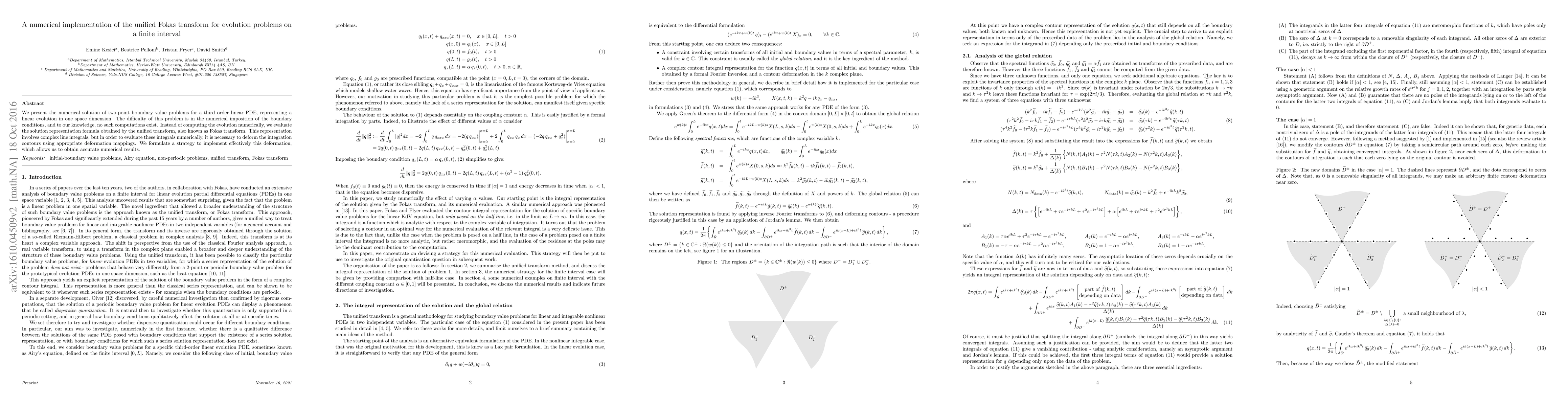 This paper presents a numerical implementation of the unified Fokas transform to solve a third-order linear PDE for evolution problems on a finite interval, focusing on accurately imposing boundary conditions. The authors propose a strategy for deforming integration contours to evaluate complex line integrals, achieving accurate numerical results.