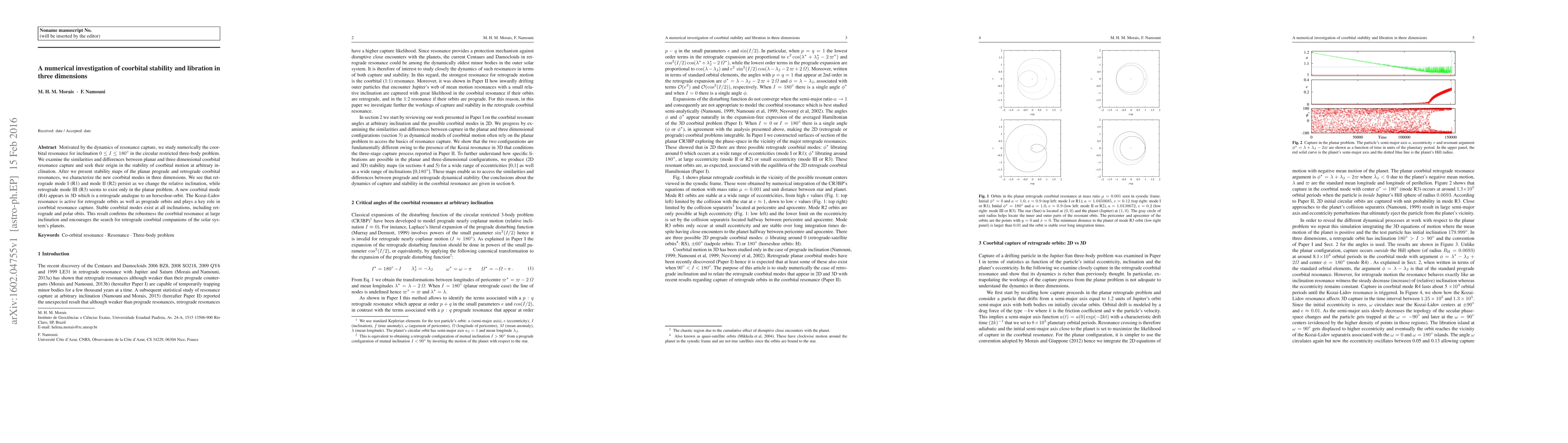 This paper investigates the stability and libration of coorbital resonances in three-dimensional space, revealing that stable retrograde and polar coorbital modes exist across various inclinations, unlike the planar problem where only prograde modes were stable. The study highlights the importance of the Kozai-Lidov mechanism in capturing coorbital resonance.