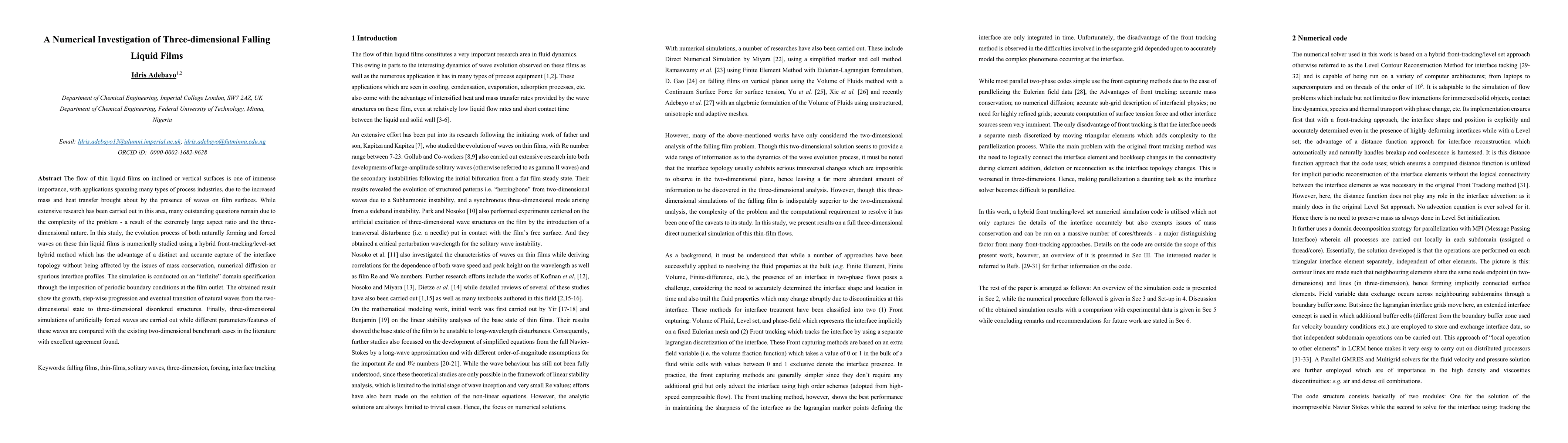 The flow of thin liquid films on inclined or vertical surfaces is one of immense importance, with applications spanning many types of process industries, due to the increased mass and heat transfer brought about by the presence of waves on film surfaces. While extensive research has been carried out in this area, many outstanding questions remain due to the complexity of the problem - a result of the extremely large aspect ratio and the three-dimensional nature. In this study, the evolution process of both naturally forming and forced waves on these thin liquid films is numerically studied using a hybrid front-tracking/level-set hybrid method which has the advantage of a distinct and accurate capture of the interface topology without being affected by the issues of mass conservation, numerical diffusion or spurious interface profiles. The simulation is conducted on an infinite domain specification through the imposition of periodic boundary conditions at the film outlet. The obtained results show the growth, step-wise progression, and eventual transition of natural waves from the two-dimensional state to three-dimensional disordered structures. Finally, three-dimensional simulations of artificially forced waves are carried out while different parameters/features of these waves are compared with the existing two-dimensional benchmark cases in the literature with excellent agreement found. Keywords: falling films, thin films, solitary waves, three-dimension, forcing, interface tracking