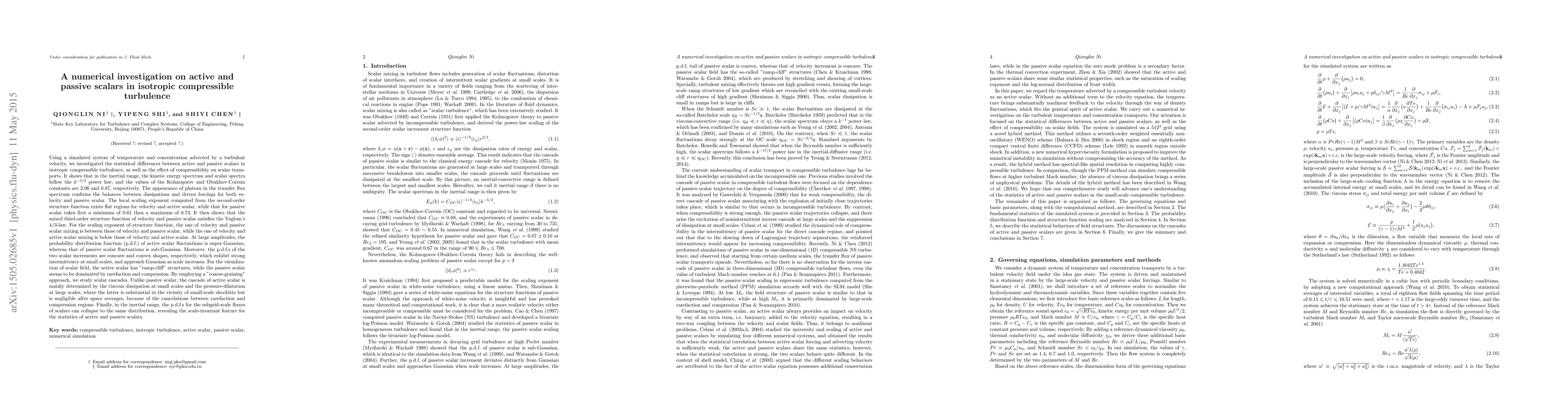 This paper examines the statistical differences between active and passive scalars in isotropic compressible turbulence, finding that while both follow Kolmogorov spectra, active scalars exhibit super-Gaussian fluctuations and "ramp-cliff" structures, whereas passive scalars show sub-Gaussian behavior and rarefaction-compression effects, highlighting distinct intermittency and cascade processes.