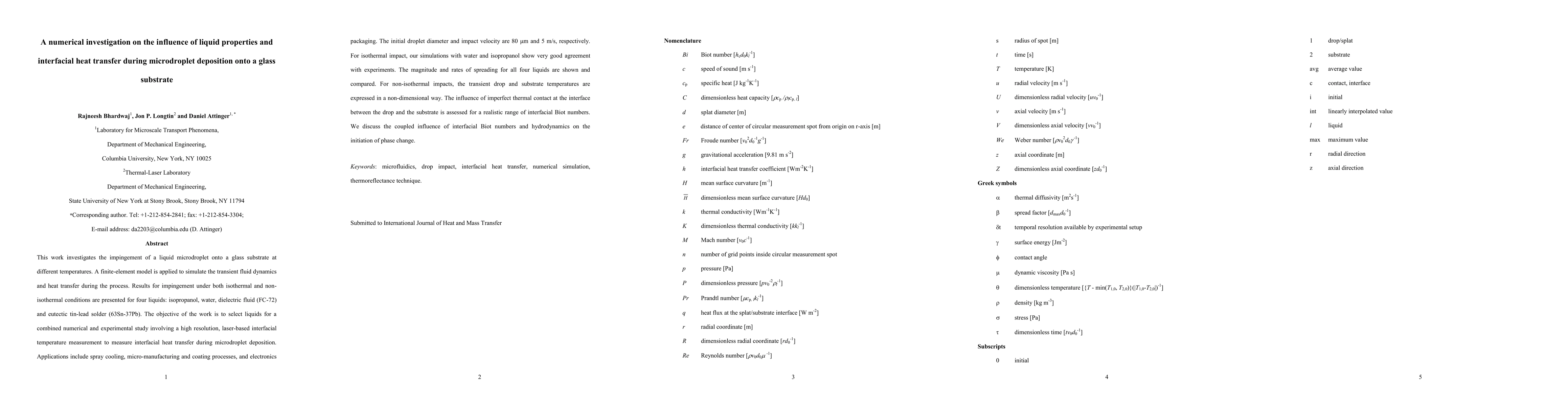 This study uses a finite-element model to simulate the transient fluid dynamics and heat transfer during the deposition of microdroplets of four different liquids onto a glass substrate at varying temperatures. The research aims to identify optimal liquids for a combined numerical and experimental study to measure interfacial heat transfer, with applications in spray cooling, micro-manufacturing, and electronics packaging.