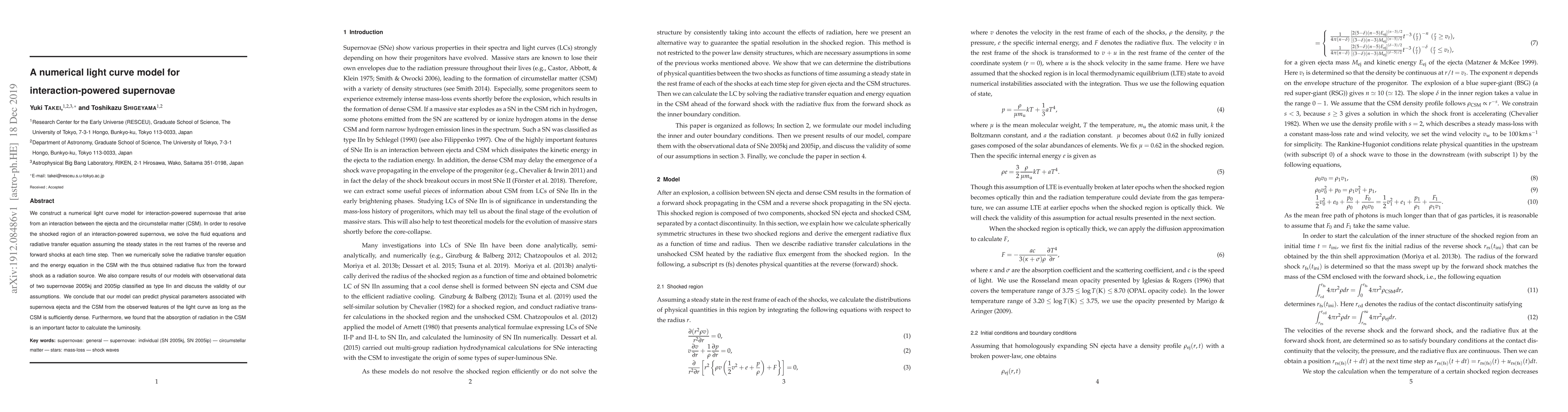 This paper develops a numerical model to simulate light curves of interaction-powered supernovae, focusing on the interaction between ejecta and circumstellar matter. The model's predictions are validated against observational data from supernovae 2005kj and 2005ip, showing its effectiveness in predicting physical parameters when the circumstellar matter is dense.