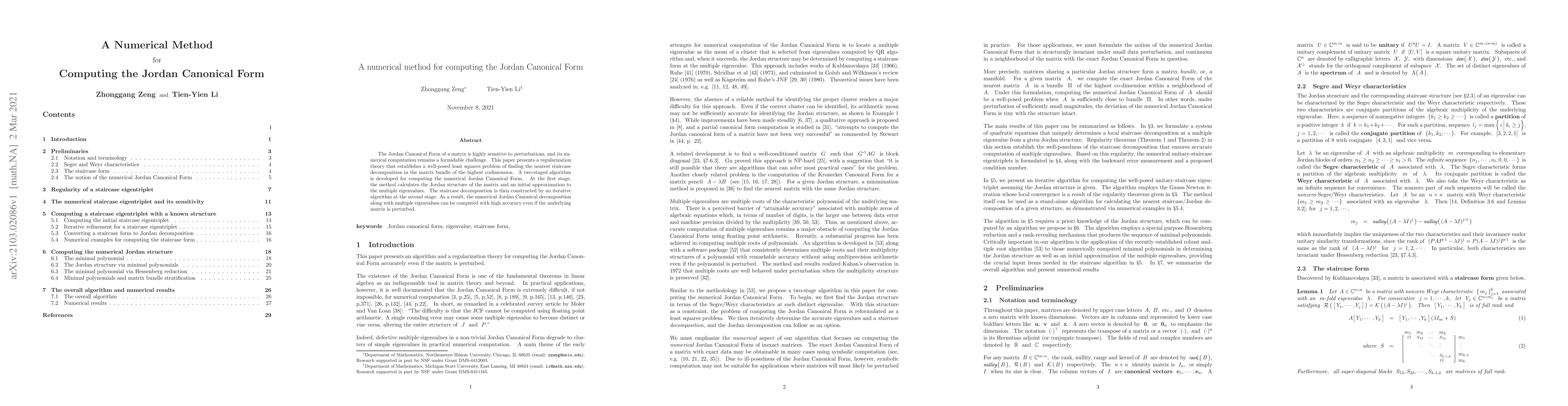 The Jordan Canonical Form of a matrix is highly sensitive to perturbations, and its numerical computation remains a formidable challenge. This paper presents a regularization theory that establishes a well-posed least squares problem of finding the nearest staircase decomposition in the matrix bundle of the highest codimension. A two-staged algorithm is developed for computing the numerical Jordan Canonical Form. At the first stage, the method calculates the Jordan structure of the matrix and an initial approximation to the multiple eigenvalues. The staircase decomposition is then constructed by an iterative algorithm at the second stage. As a result, the numerical Jordan Canonical decomposition along with multiple eigenvalues can be computed with high accuracy even if the underlying matrix is perturbed.