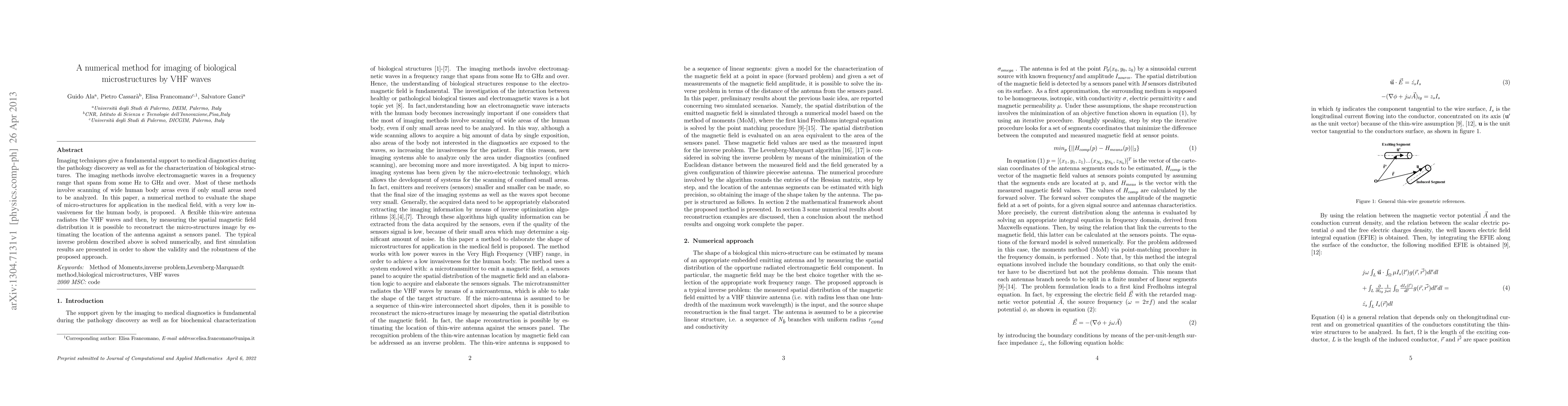 Imaging techniques give a fundamental support to medical diagnostics during the pathology discovery as well as for the characterization of biological structures. The imaging methods involve electromagnetic waves in a frequency range that spans from some Hz to GHz and over. Most of these methods involve scanning of wide human body areas even if only small areas need to be analyzed. In this paper, a numerical method to evaluate the shape of micro-structures for application in the medical field, with a very low invasiveness for the human body, is proposed. A flexible thin-wire antenna radiates the VHF waves and then, by measuring the spatial magnetic field distribution it is possible to reconstruct the micro-structures image by estimating the location of the antenna against a sensors panel. The typical inverse problem described above is solved numerically, and first simulation results are presented in order to show the validity and the robustness of the proposed approach.