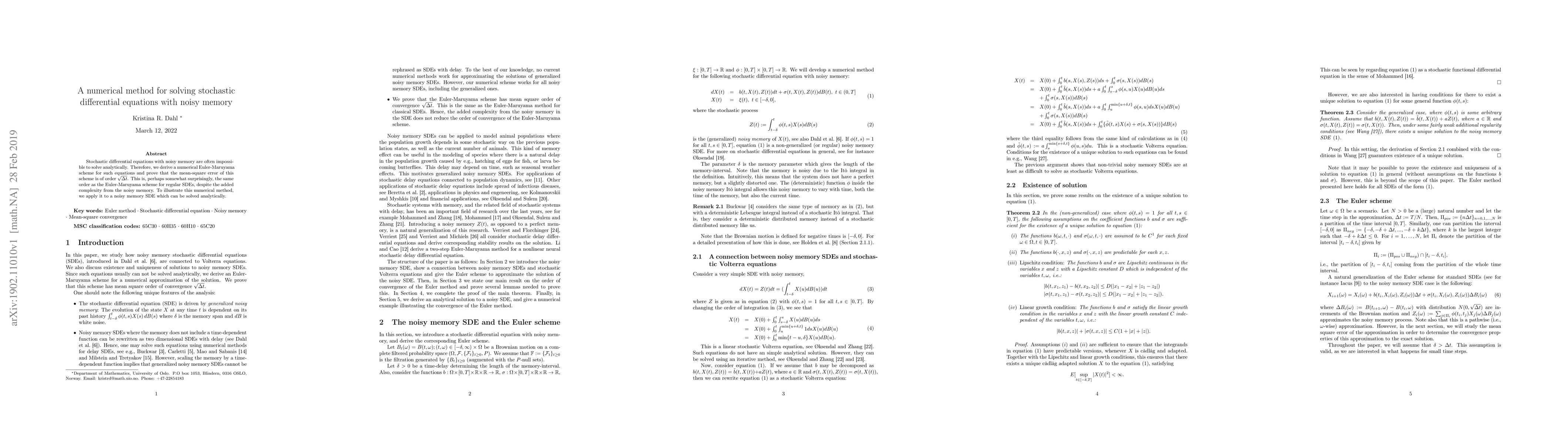 This paper develops a numerical Euler-Maruyama scheme for solving stochastic differential equations with noisy memory, proving its mean-square error is of order $\sqrt{\Delta t}$, comparable to regular SDEs. The method is demonstrated on an analytically solvable noisy memory SDE.