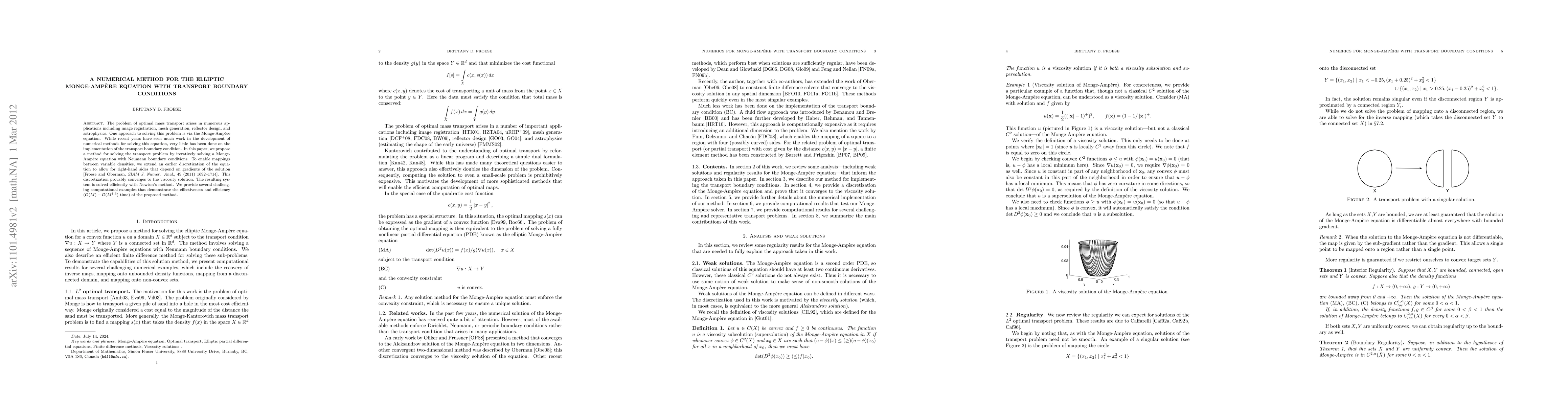 The problem of optimal mass transport arises in numerous applications including image registration, mesh generation, reflector design, and astrophysics. One approach to solving this problem is via the Monge-Amp\`ere equation. While recent years have seen much work in the development of numerical methods for solving this equation, very little has been done on the implementation of the transport boundary condition. In this paper, we propose a method for solving the transport problem by iteratively solving a Monge-Amp\`ere equation with Neumann boundary conditions. To enable mappings between variable densities, we extend an earlier discretization of the equation to allow for right-hand sides that depend on gradients of the solution [Froese and Oberman, SIAM J. Numer. Anal., 49 (2011) 1692--1714]. This discretization provably converges to the viscosity solution. The resulting system is solved efficiently with Newton's method. We provide several challenging computational examples that demonstrate the effectiveness and efficiency ($O(M)-O(M^{1.3})$ time) of the proposed method.