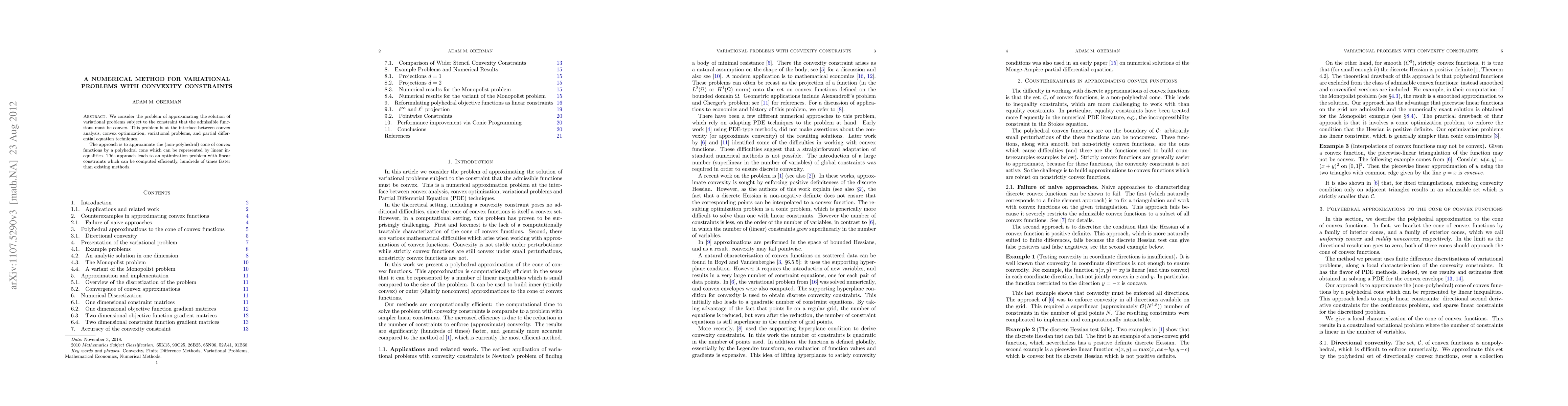 We consider the problem of approximating the solution of variational problems subject to the constraint that the admissible functions must be convex. This problem is at the interface between convex analysis, convex optimization, variational problems, and partial differential equation techniques. The approach is to approximate the (non-polyhedral) cone of convex functions by a polyhedral cone which can be represented by linear inequalities. This approach leads to an optimization problem with linear constraints which can be computed efficiently, hundreds of times faster than existing methods.