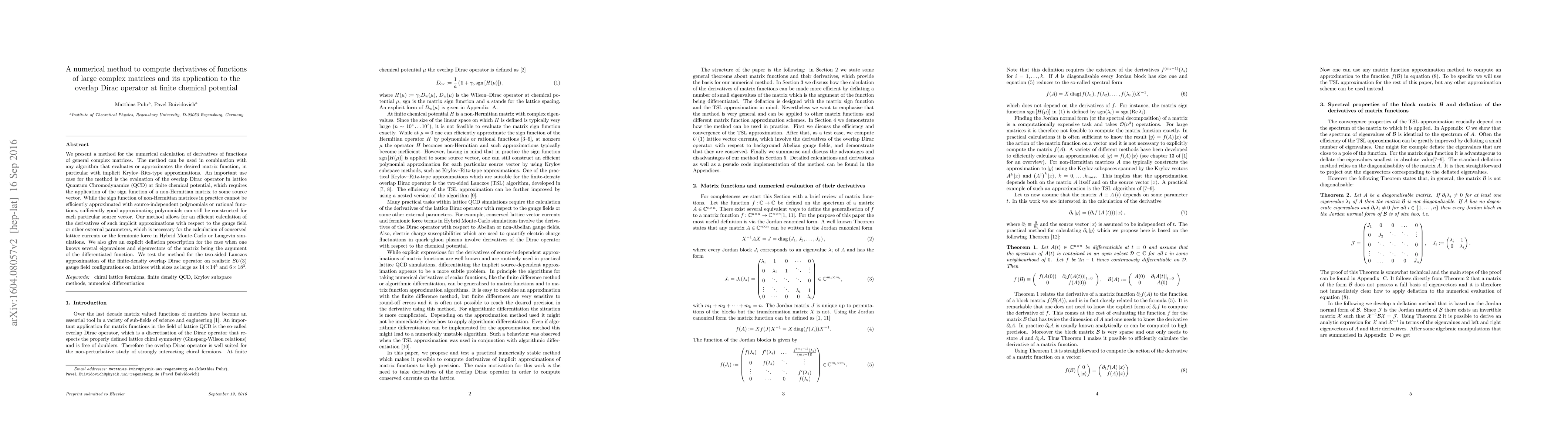 This paper introduces a numerical method for computing derivatives of functions of large complex matrices, applicable to the evaluation of the overlap Dirac operator in lattice QCD at finite chemical potential. The method efficiently calculates derivatives of implicit approximations, crucial for simulations involving conserved lattice currents or fermionic force.