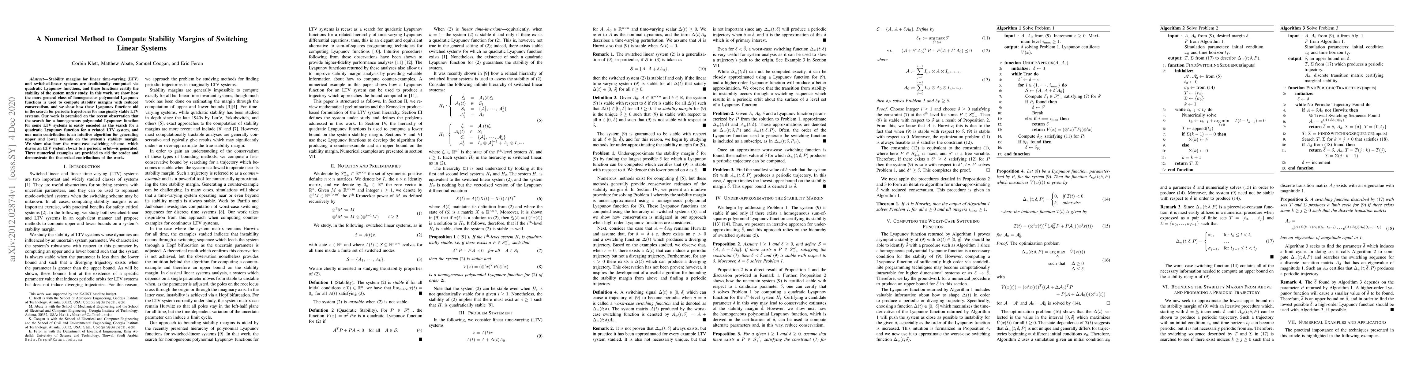 Stability margins for linear time-varying (LTV) and switched-linear systems are traditionally computed via quadratic Lyapunov functions, and these functions certify the stability of the system under study. In this work, we show how the more general class of homogeneous polynomial Lyapunov functions is used to compute stability margins with reduced conservatism, and we show how these Lyapunov functions aid in the search for periodic trajectories for marginally stable LTV systems. Our work is premised on the recent observation that the search for a homogeneous polynomial Lyapunov function for some LTV systems is easily encoded as the search for a quadratic Lyapunov function for a related LTV system, and our main contribution is an intuitive algorithm for generating upper and lower bounds on the system's stability margin. We show also how the worst-case switching scheme - which draws an LTV system closest to a periodic orbit - is generated. Three numerical examples are provided to aid the reader and demonstrate the theoretical contributions of the work.