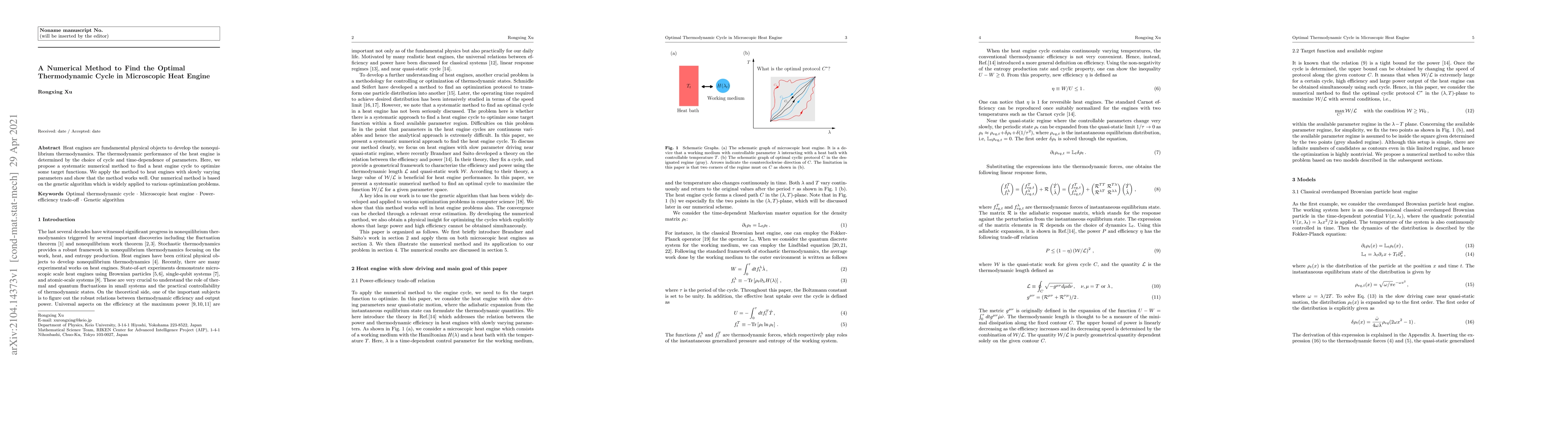 This paper proposes a systematic numerical method using genetic algorithms to optimize the thermodynamic cycle of microscopic heat engines, demonstrating its effectiveness for engines with slowly varying parameters. The method aims to enhance the performance of heat engines by selecting the best cycle for specific target functions.