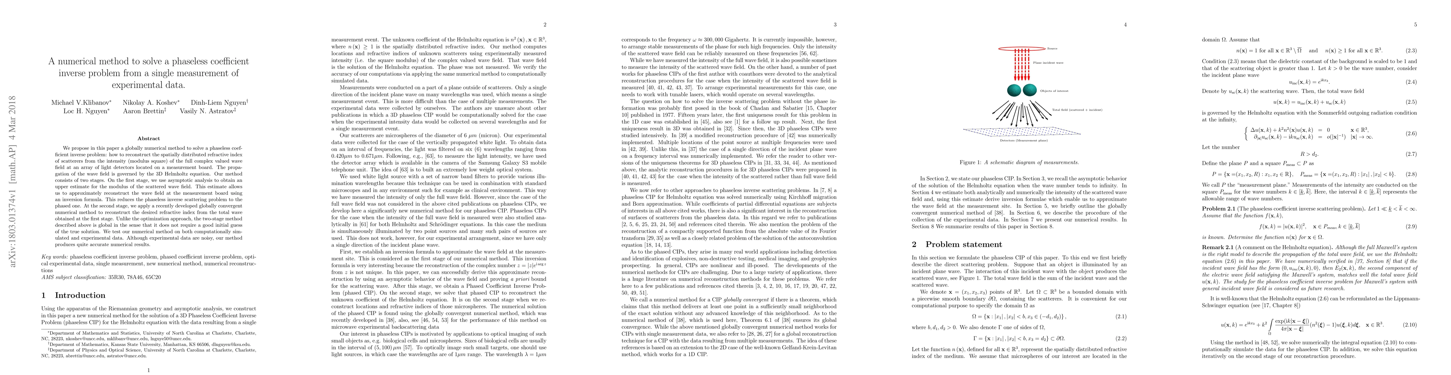 This paper proposes a two-stage numerical method to solve a phaseless inverse scattering problem, reconstructing the refractive index from intensity measurements. The method uses asymptotic analysis to approximate the scattered wave field and then applies a globally convergent numerical technique to determine the refractive index, yielding accurate results even with noisy experimental data.
