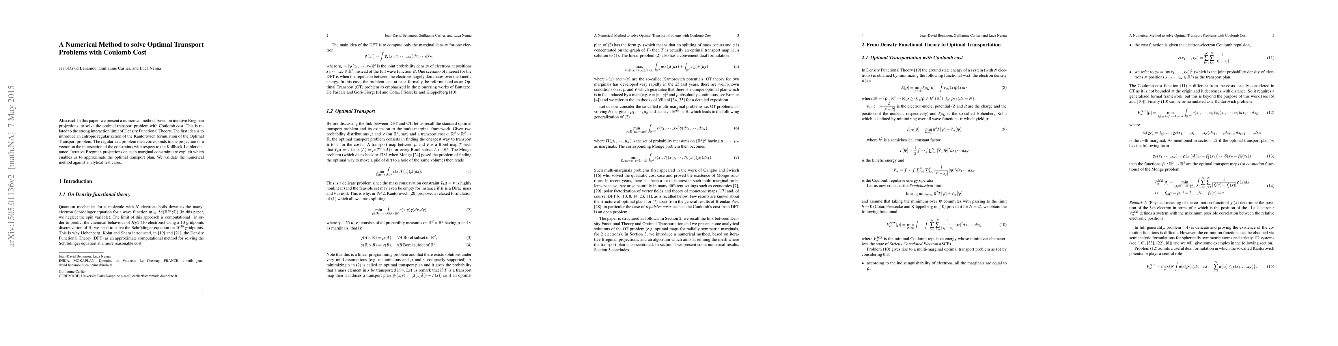 This paper introduces a numerical method using iterative Bregman projections to solve optimal transport problems with Coulomb cost, relevant to the strong interaction limit of Density Functional Theory. The method employs entropic regularization of the Kantorovich formulation and validates the approach through analytical test cases.