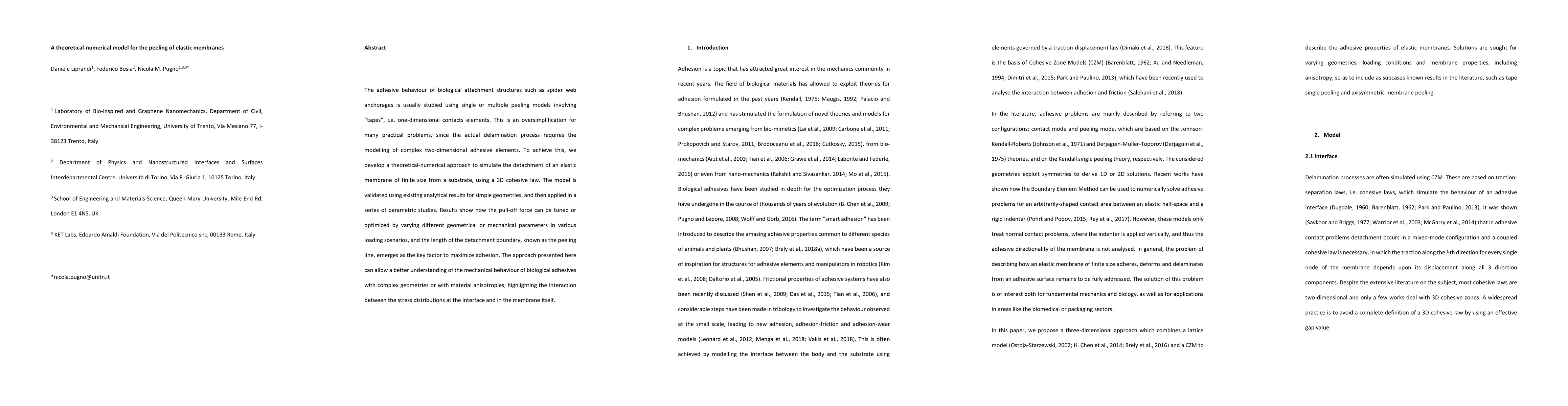 The adhesive behaviour of biological attachment structures such as spider web anchorages is usually studied using single or multiple peeling models involving "tapes", i.e. one-dimensional contacts elements. This is an oversimplification for many practical problems, since the actual delamination process requires the modelling of complex two-dimensional adhesive elements. To achieve this, we develop a numerical approach to simulate the detachment of an elastic membrane of finite size from a substrate, using a 3D cohesive law. The model is validated using existing analytical results for simple geometries, and then applied in a series of parametric studies. Results show how the pull-off force can be tuned or optimized by varying different geometrical or mechanical parameters in various loading scenarios, and the length of the detachment boundary, known as the peeling line, emerges as the key factor to maximize adhesion. The approach presented here can allow a better understanding of the mechanical behaviour of biological adhesives with complex geometries or with material anisotropies, highlighting the interaction between the stress distributions at the interface and in the membrane itself.