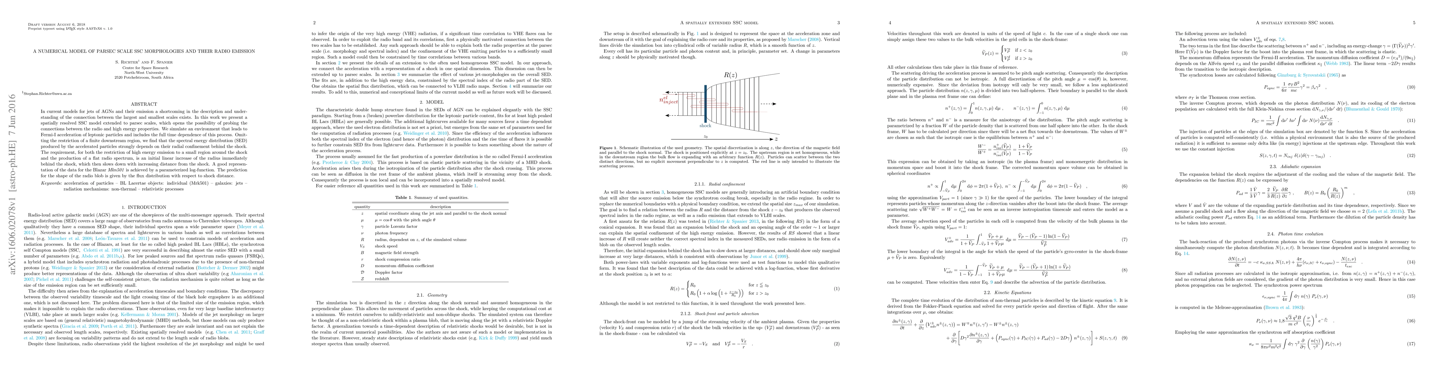 In current models for jets of AGNs and their emission a shortcoming in the description and understanding of the connection between the largest and smallest scales exists. In this work we present a spatially resolved SSC model extended to parsec scales, which opens the possibility of probing the connections between the radio and high energy properties. We simulate an environment that leads to Fermi-I acceleration of leptonic particles and includes the full time dependence of this process. Omitting the restriction of a finite downstream region, we find that the spectral energy distribution (SED) produced by the accelerated particles strongly depends on their radial confinement behind the shock. The requirement, for both the restriction of high energy emission to a small region around the shock and the production of a flat radio spectrum, is an initial linear increase of the radius immediately behind the shock, which then slows down with increasing distance from the shock. A good representation of the data for the Blazar \textit{Mkn501} is achieved by a parameterized log-function. The prediction for the shape of the radio blob is given by the flux distribution with respect to shock distance.