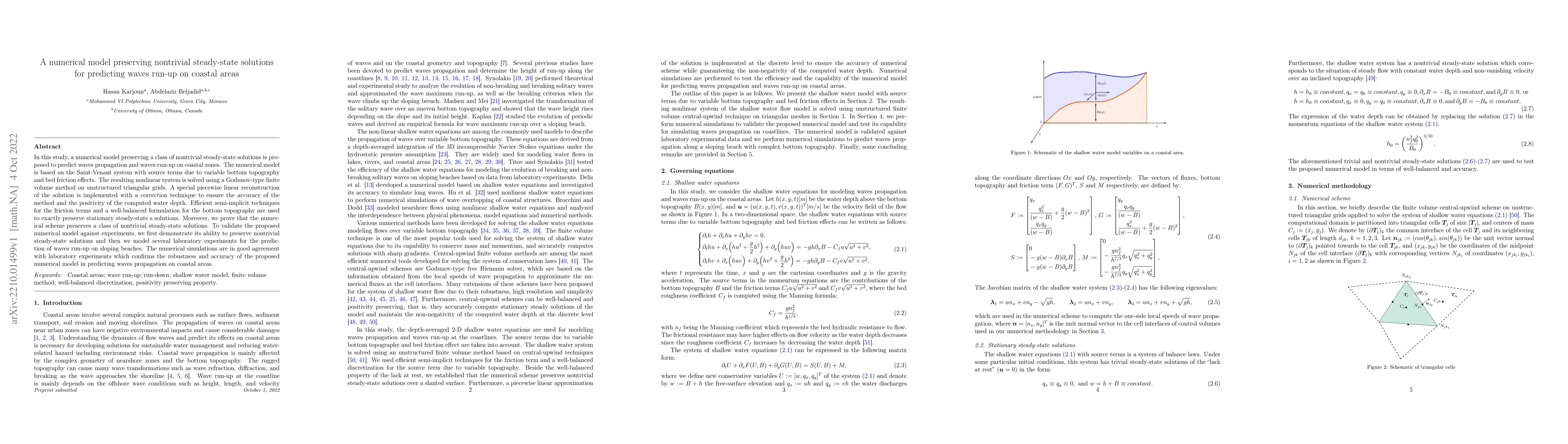 This paper proposes a numerical model based on the Saint-Venant equations to predict wave run-up on coastal areas, ensuring the preservation of nontrivial steady-state solutions. The model uses a Godunov-type finite volume method and is validated against laboratory experiments, demonstrating its accuracy and robustness.